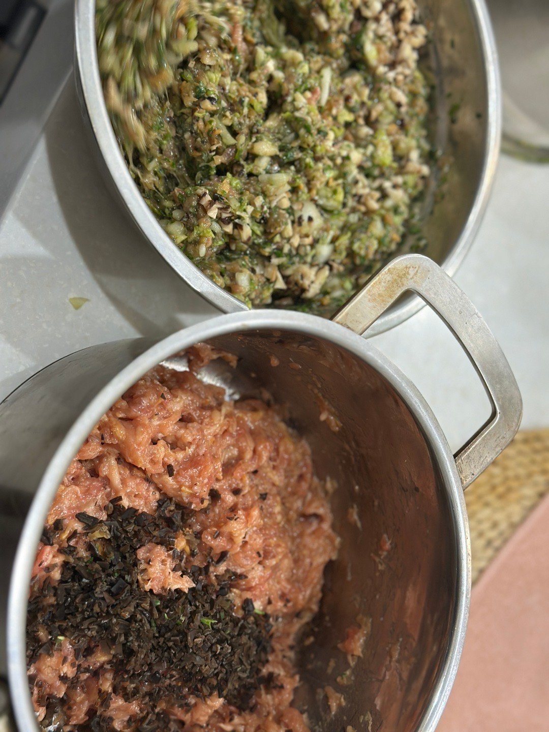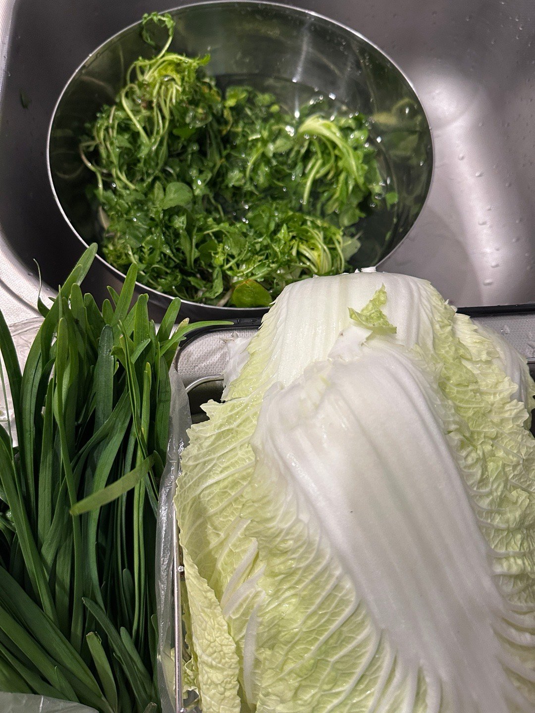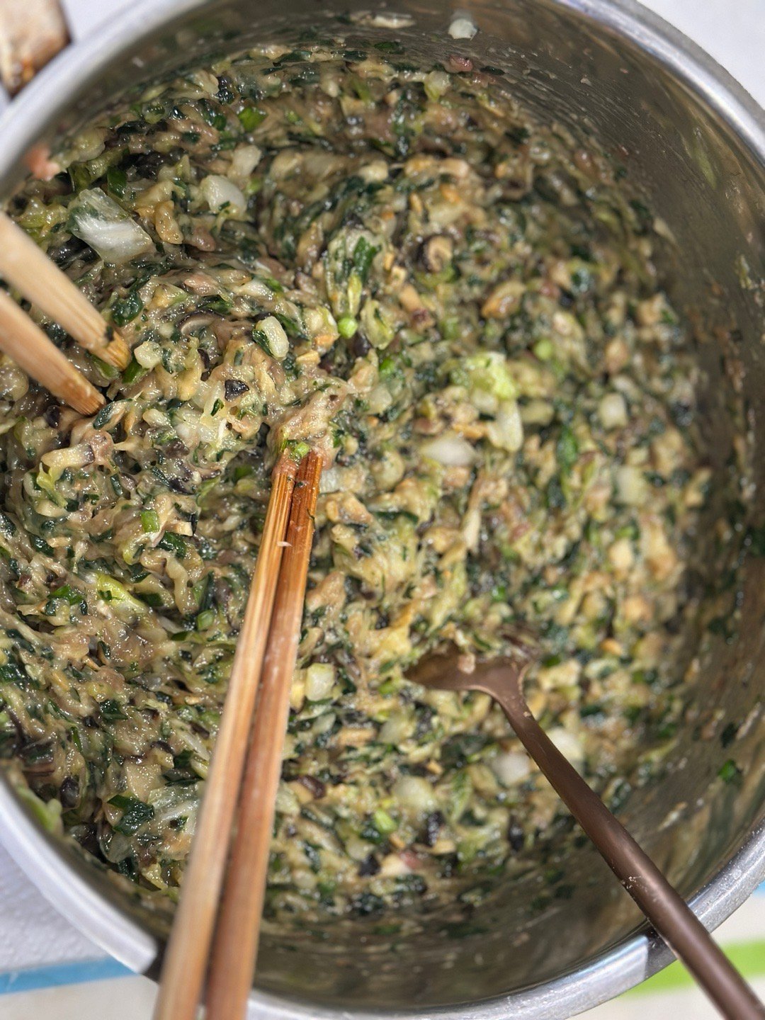 猪肉馅,白菜作为基底,一种加韭菜,一种加荠菜。起鲜的诀窍,是用虾皮炒至金黄,和鸡蛋、木耳与香菇一起拌进馅料。放的是生抽,以及麻油。