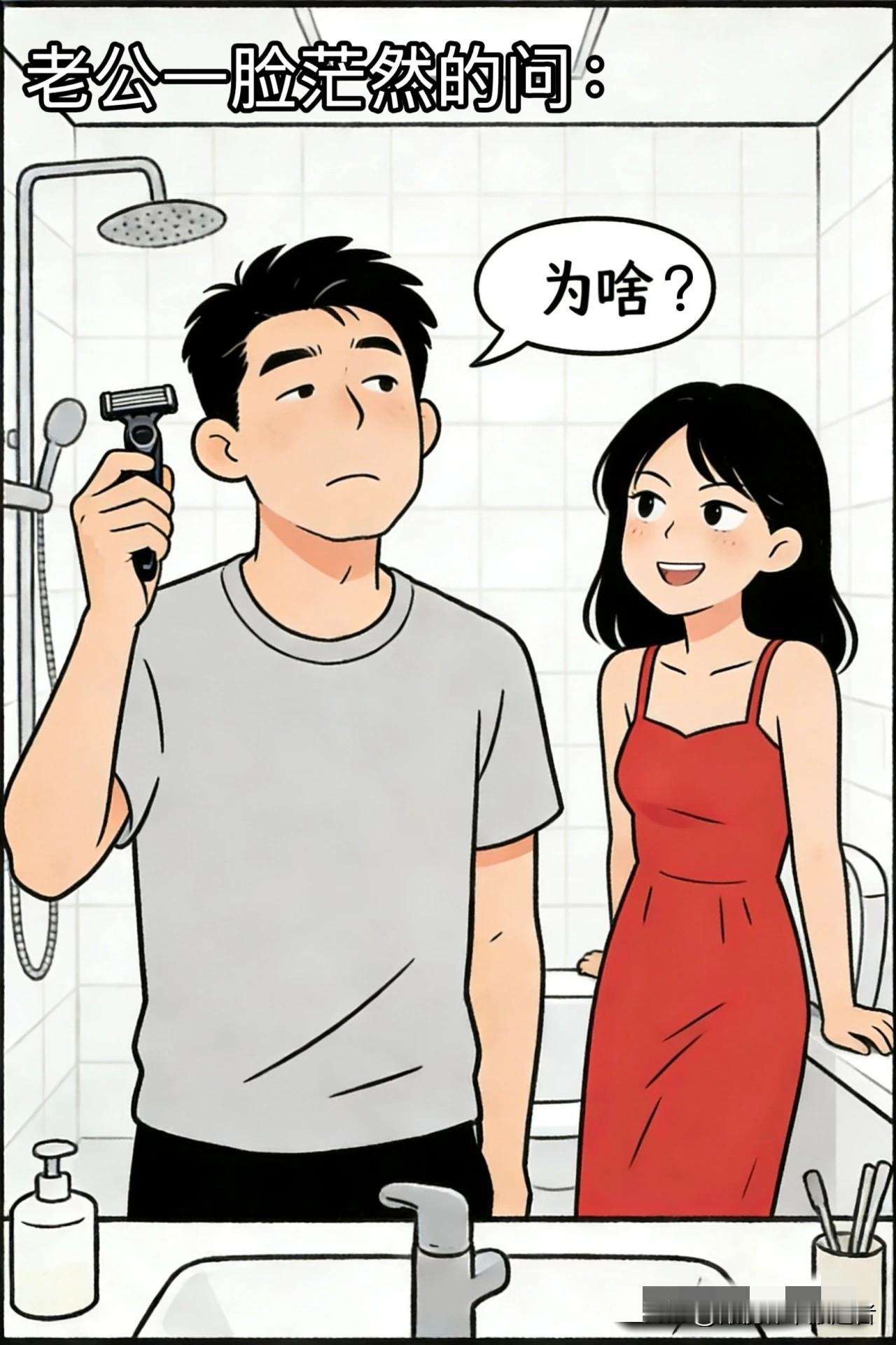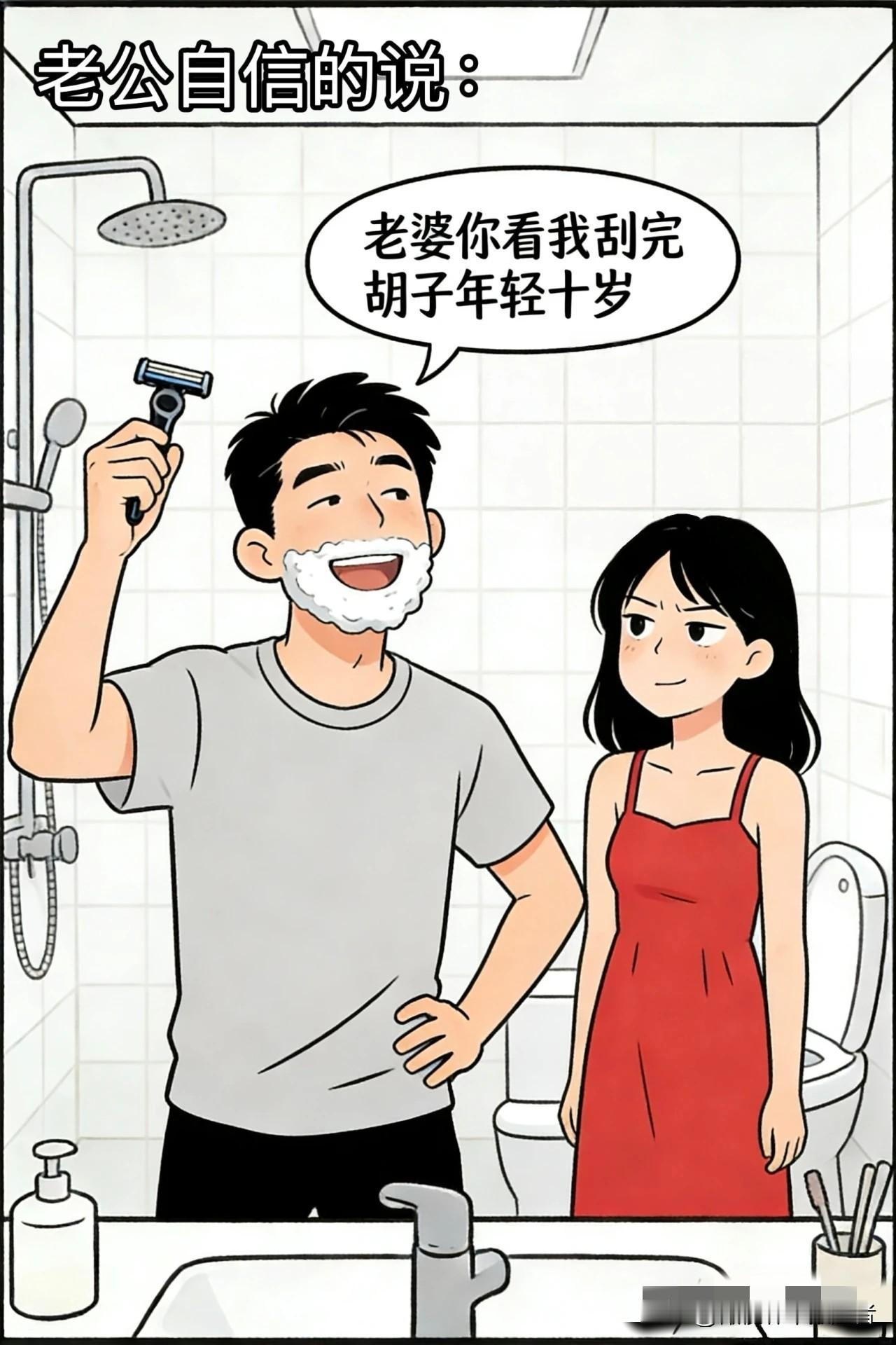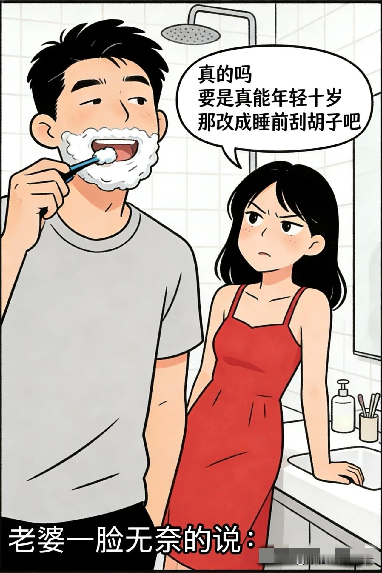 趣味漫画:早上起床后,老公:老婆你看我,刮完胡子年轻十岁。我一脸无奈说:真的吗?要真能年轻十岁,那睡前刮胡子吧