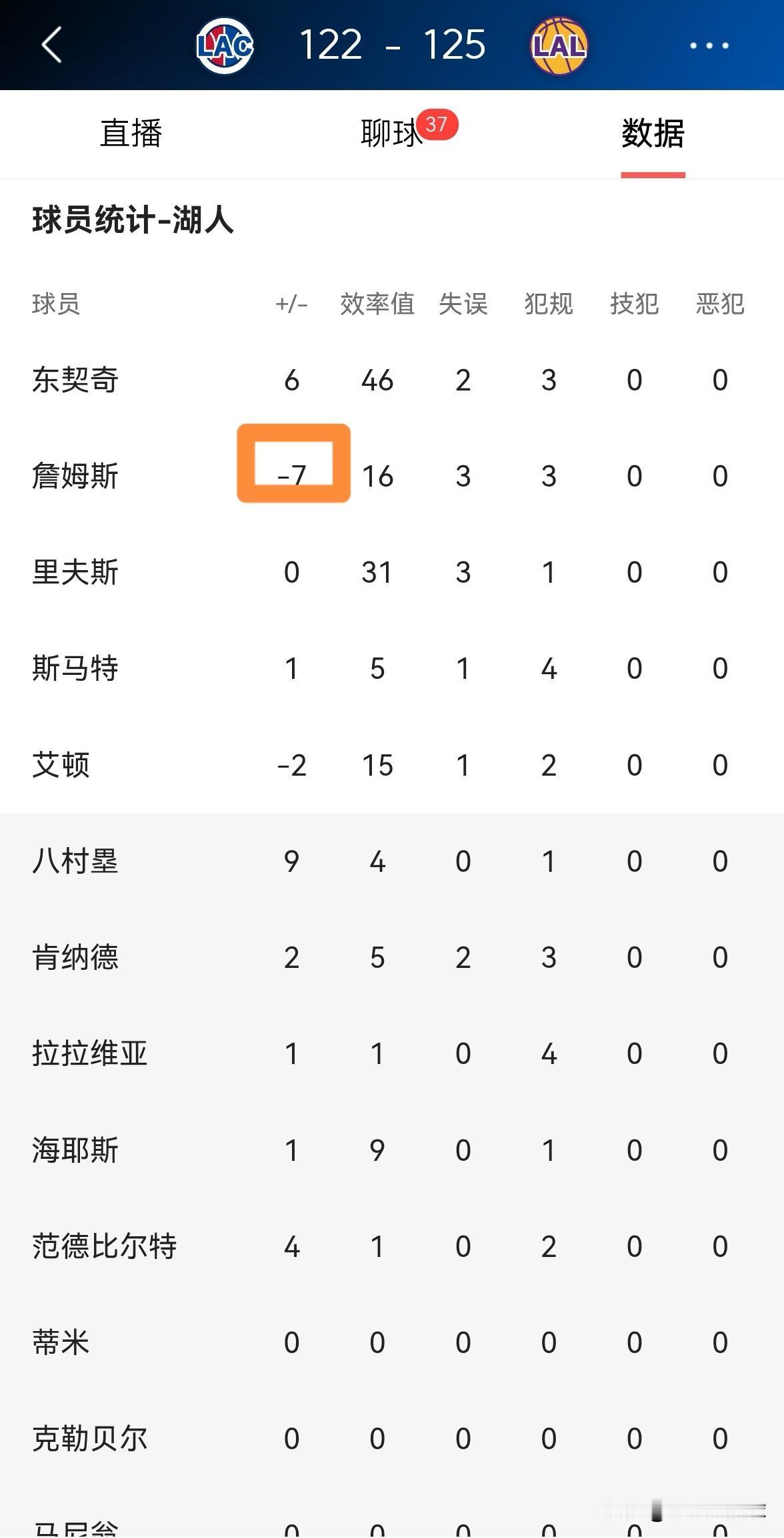 湖人巨星詹姆斯真是太尴尬了,他的场上正负值又是全队最低。虽然今天湖人在主场以125:122险胜快船,但是詹姆斯的场上正负值却是全队最低的-7。 全场比赛下来,詹姆斯首发出战33分钟,投篮13中5,其中三分球3中1、罚球2中2非常低效的得到13分,还有3次失误和3次犯规,他的场上正负值为球队最低的-7。 坦白说,每当我看到詹姆斯的场上正负值是全队最低,我都为詹姆斯感到尴尬。