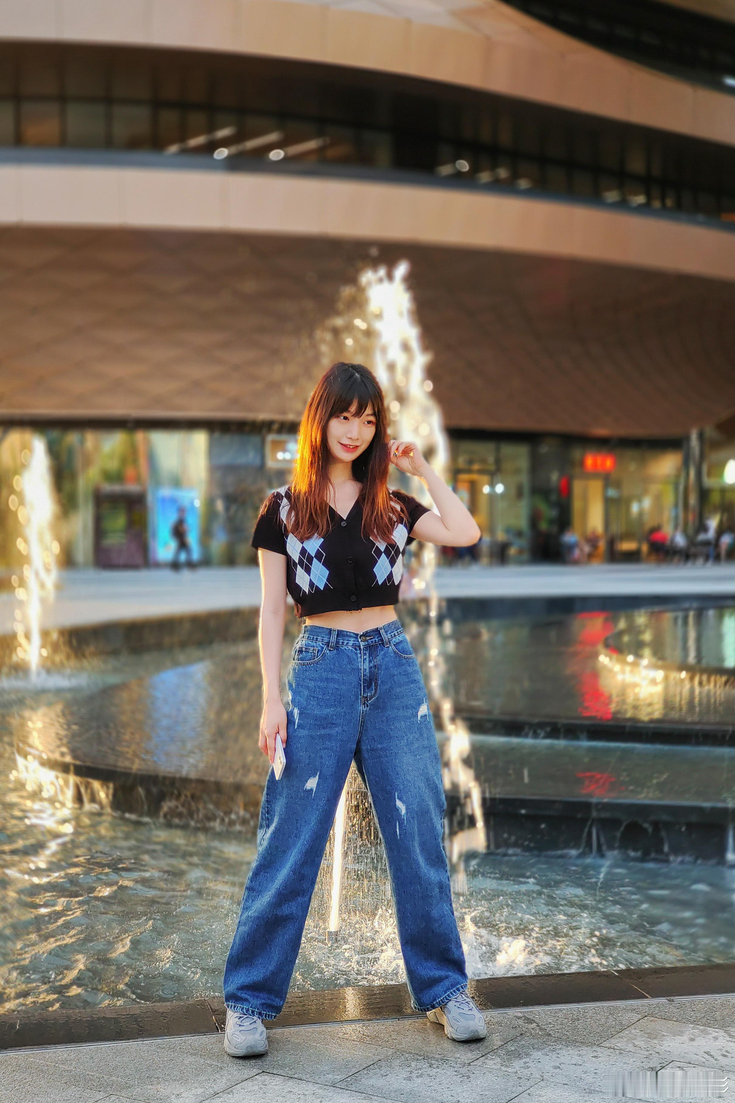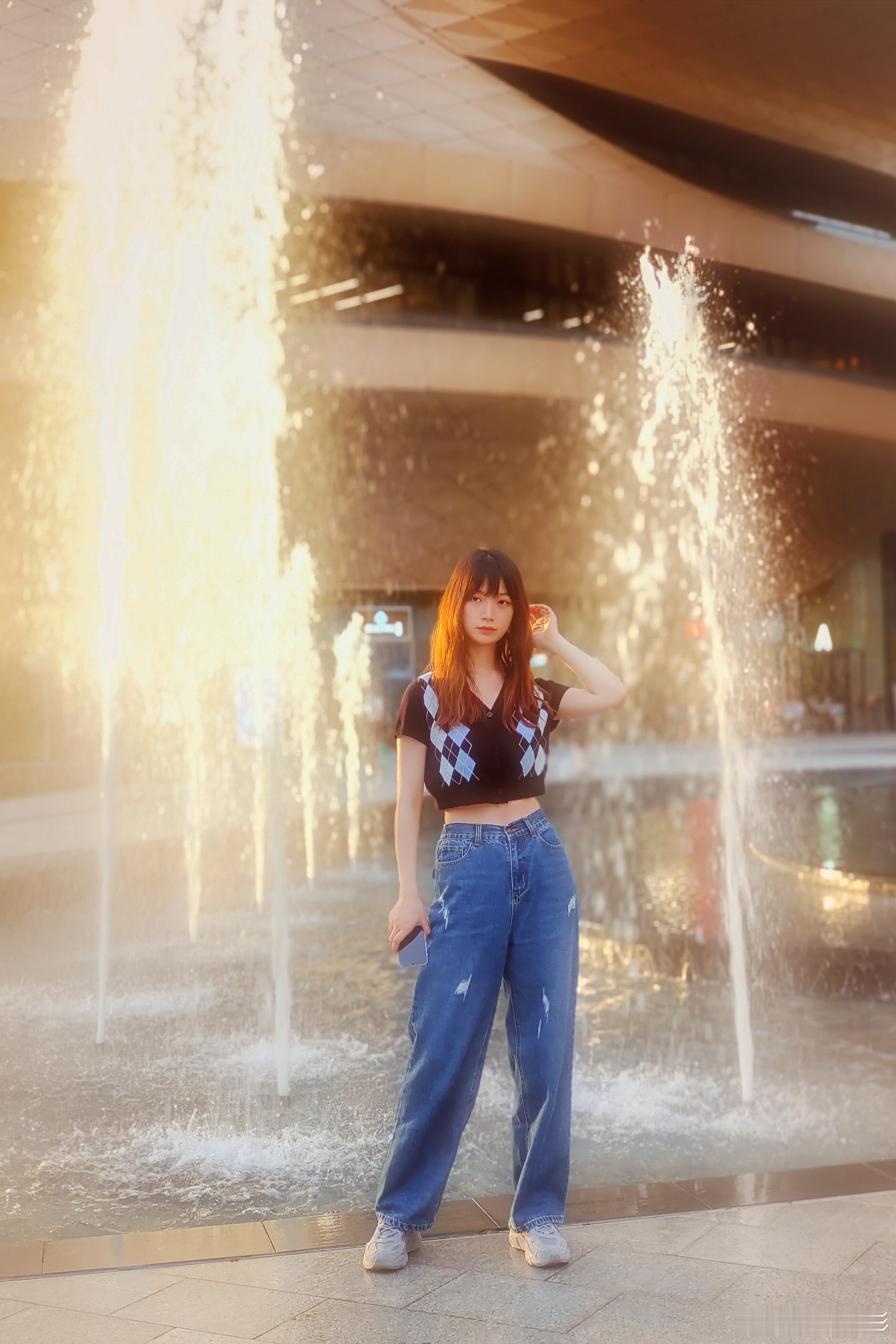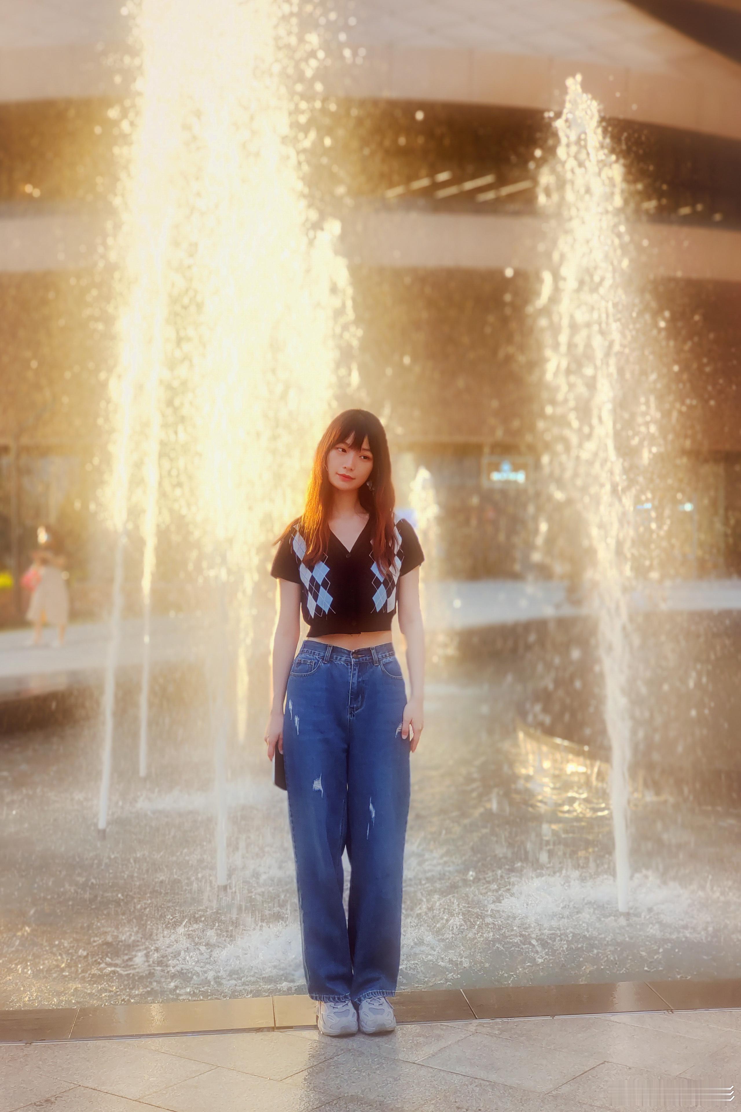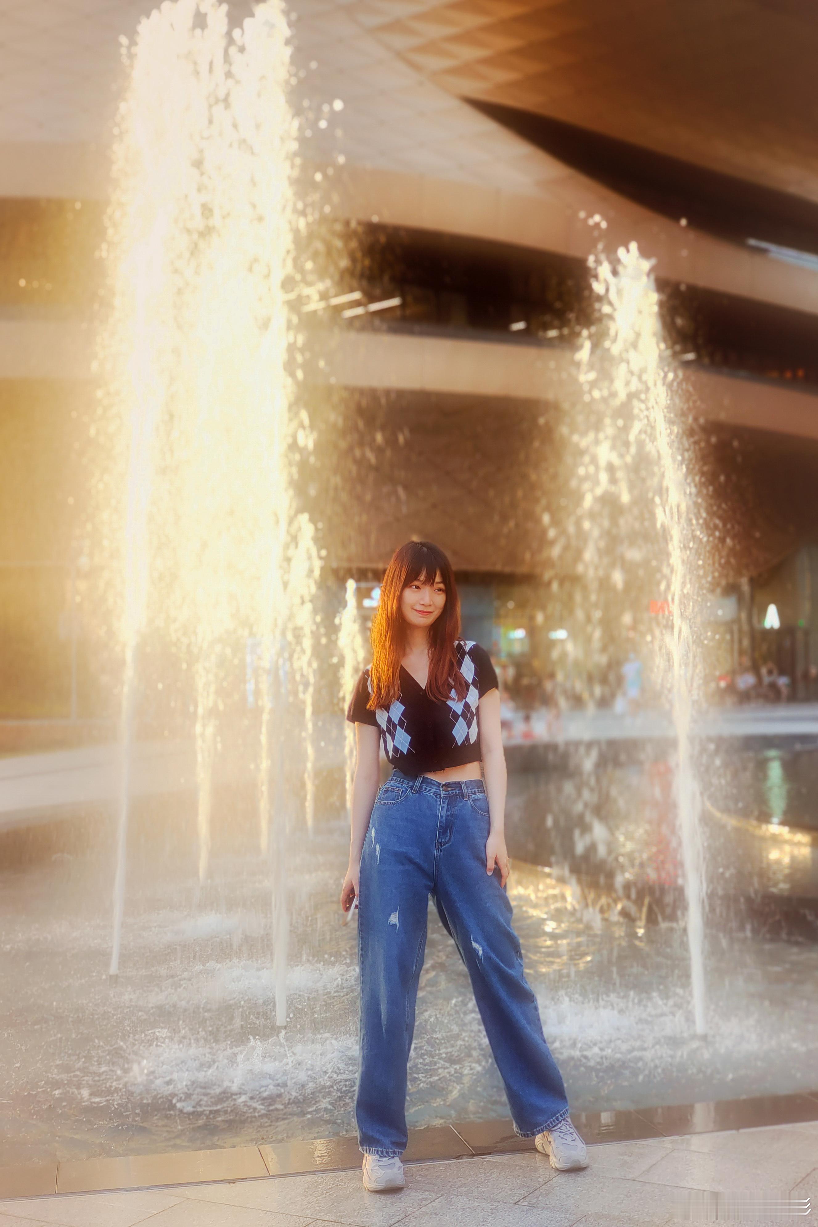 在无限极广场,身穿蓝色牛仔裤发少女被水雾和夕阳包围,每一帧都是心动的瞬间!