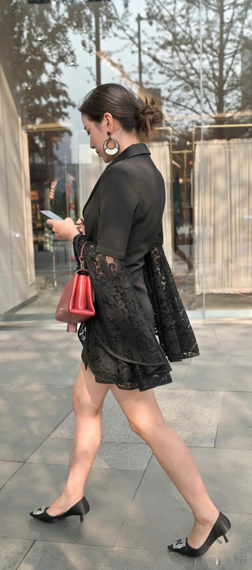 黑色西装裙搭配红色包包,干练又有亮点,走在街上回头率超高,简约又不失精致感。