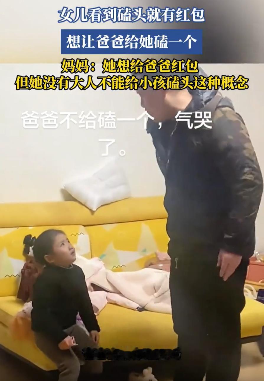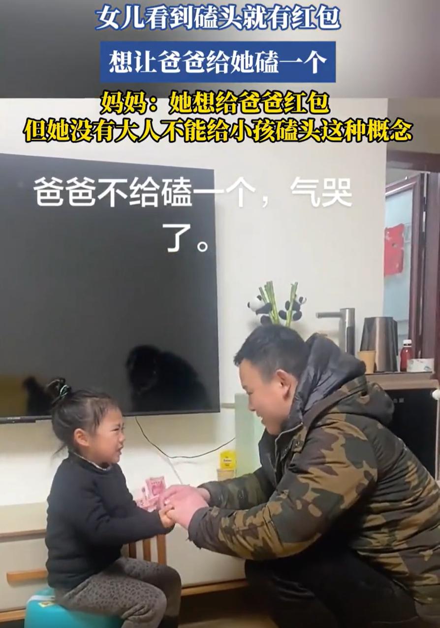 倒反天罡!广东,一女孩收到压岁钱,打算把钱给爸爸,谁知走到爸爸面前却只是把钱拿出来,然后让爸爸给她磕个头,见爸爸不同意,女孩直接气哭了,妈妈见状笑得不行,但网友却觉得很不妥 过年期间,小姑娘跟着爸妈去串门,高高兴兴收了一沓压岁钱。可能在她小小的脑袋瓜里,刚刚经历的画面是这样的:见到长辈,说句吉祥话,或者磕个头,对方就笑眯眯地递过来一个大红包。这个因果关系,她记得牢牢的 回到家后,小姑娘攥着刚到手的巨款,心里可能琢磨开了。她没想着把红包捂热乎了自己花,而是直接走到了爸爸跟前。接下来的一幕,让当爸的彻底懵了 小姑娘把红包从兜里掏出来,在爸爸眼前晃了晃,然后一本正经地开了口:爸爸,你给我磕个头呗 爸爸一听,当场就拒绝了:你别胡说,我给你磕头,爸爸能给你磕头吗? 可女孩却耍起了脾气,一边哭一边缠着爸爸,坚持让爸爸磕一个头。妈妈在旁边看到这一幕,觉得很有趣,就拍了下来,并解释说孩子其实是想要给爸爸红包,但她没有大人不能给小孩磕头的概念 视频传到网上后,网友们可乐翻了,但也吵翻了 有网友说:这就是典型的童言无忌,孩子的世界很纯粹,给红包就是开心的,想用自己认为最隆重的方式把快乐分享给爸爸 也有网友认为:这就是家长教育问题,自己不正确引导解说,任由原则性问题严重颠覆 其实我觉得,孩子小不懂事,这都很正常,但家长还是要给孩子慢慢讲清楚,为什么要磕头,磕头的道理,让她明白传统文化和习俗 告诉她通常是晚辈给长辈磕头拜年,长辈才会给红包。这是一种尊重和祝福。你想对爸爸好,可以给爸爸一个拥抱,或者说一句爸爸我爱你,这比磕头更让爸爸开心 或许,这样做要比直接拒绝和在旁边笑更好一些