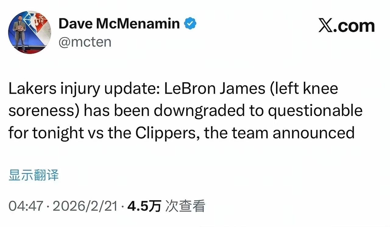 突发!!!詹姆斯左膝酸痛,洛杉矶德比大战悬了!根据记者Dave最新消息透露,湖人球星詹姆斯突发左膝酸痛,在今天对阵快船的比赛中,他的状态降级为出战成疑。 昨天湖人队的伤病名单空无一人,但是还是没能坚持到最后,詹姆斯突感不适,虽然是出战成疑,但是感觉大概率要不打了。洛杉矶德比大战少了詹姆斯情况可是不一样,昨天湖人还有六成的胜率,如果詹姆斯缺阵那又要下降不少了,预计双方会是五五开的情况。越是到了后半个赛程球员们越要注意身体,尤其是大龄球员们,季后赛的经验成为他们帮助球队赢球的关键,祝他们早日康复,远离伤病。nba湖人詹姆斯