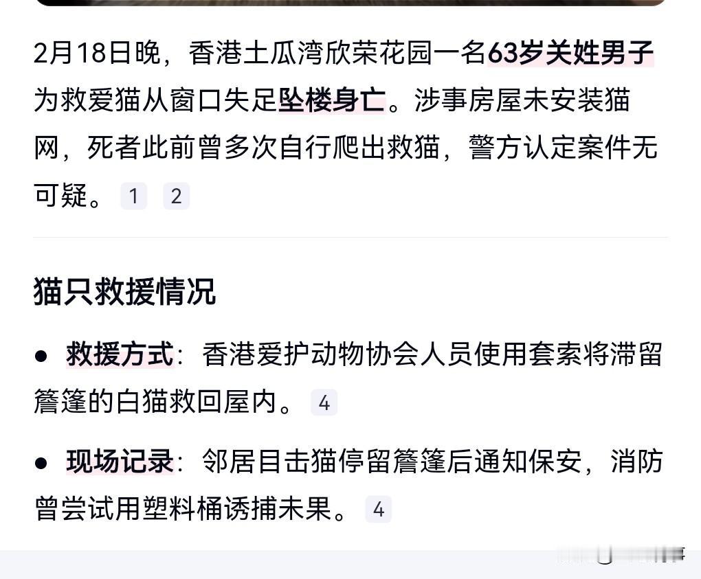 这真的是太悲剧了,看来这个安全措施很有必要啊。 2月18日晚,香港63岁男子为救猫坠亡。 这个房屋没有安装猫网封窗,死者曾多次自行爬出窗外救猫。 不出意外这次还是出意外了。 看来还是要封个窗才行啊,这样的悲剧就不会上演。