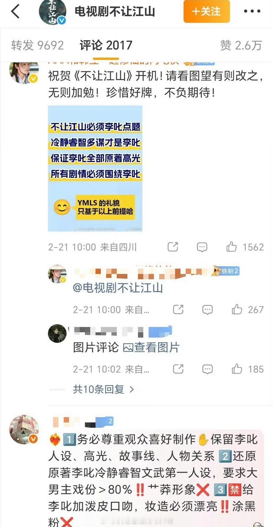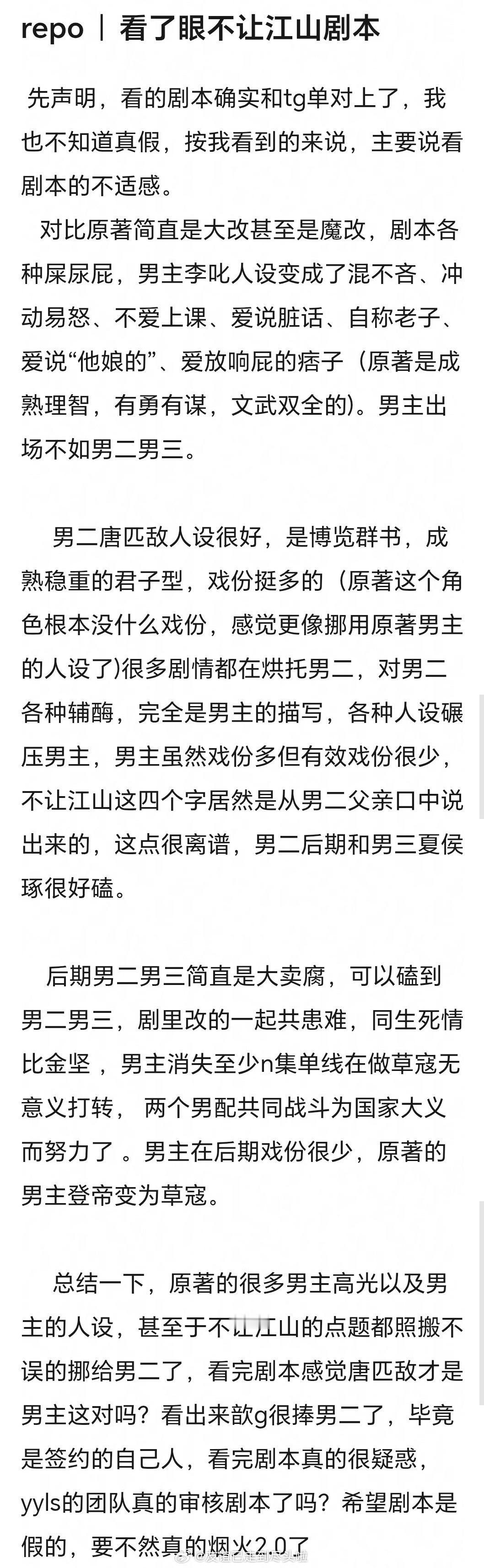 杨洋的不让江山 刚官宣羊毛老师就开始wq了。起因是有人发了疑似剧本,说男主人设不及男二,弱化男主变成脏话随口就来的小混混,男主戏份不保证不让江山女主 不让江山官宣杨洋