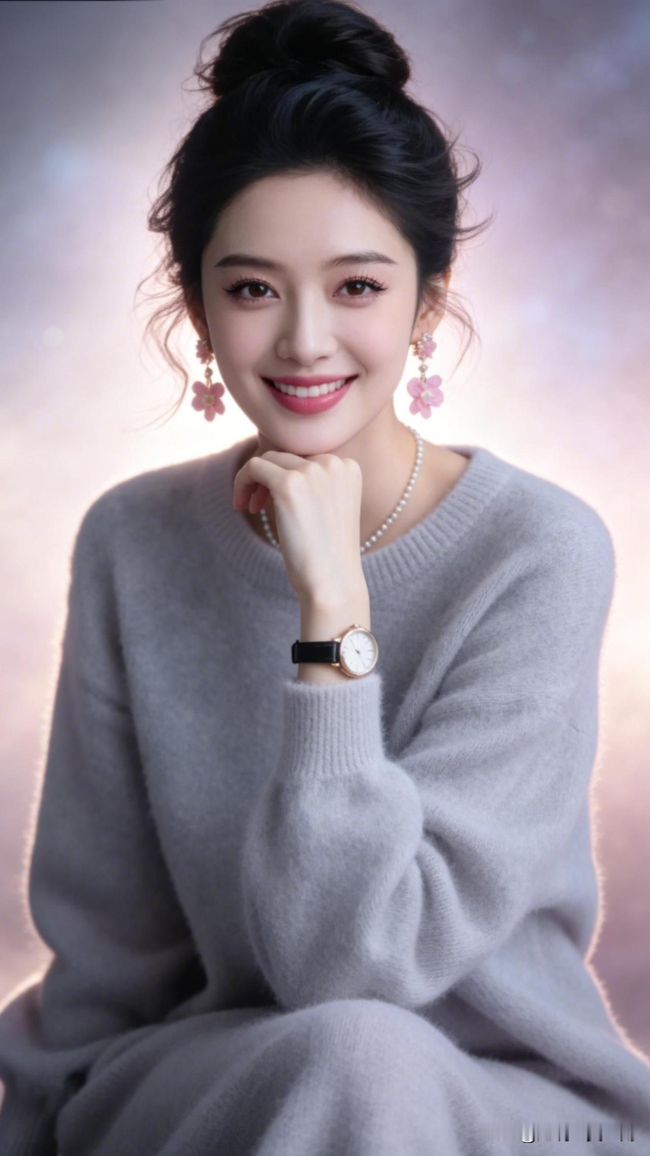 温柔甜美的少女,粉色花朵耳环,灰色毛衣,微笑动人什么样的美人算是东方美人