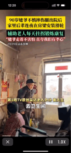 太有才了!90岁姥爷摔伤腿出院后,家中孙辈立马在房梁安装轨道滑轮,辅助老人每天拄着双拐锻炼身体。老人:很放心,走着一点儿都不害怕,孙子辈有才又有孝心! 山东滨州,90岁的姥爷身子骨一直挺硬朗,和姥姥二人生活在农村,他们平时还能自己遛弯儿、收拾院子。可就在年前,他上卫生间的时候不小心滑了一下,“哐当”一声摔在了地上,把家里人当时都吓懵了。 家人紧急把老人送到医院一检查,是骨折。医生说得赶紧手术,不然以后可能站不起来。全家人的心都提到了嗓子眼,好在手术挺顺利,终于赶在过年前,姥爷出院回了家。 但医生的话像块石头压在孩子们的心上:“老人年纪大了,肌肉恢复慢,必须每天坚持拄拐锻炼,不然肌肉一萎缩,以后就真走不了路了。” 出院回家以后,姥爷在床上躺了几天,想到医生的话,姥爷试着拄拐要站起来锻炼,就让孩子们在一边扶着他走路。 开始的几天,每天孩子们都会扶着他走上一会,孩子们也乐意扶着姥爷,陪他锻练。但随着假期越来越接近尾声,孩子们也会在不久之后都回去要上班、要照顾孩子,哪能天天守在旁边扶着?请护工吧,一来家里人不放心,姥姥姥夫也不同意,二来因为康复是个慢功夫,耗不起啊。 于是家里的孙子辈就琢磨着能不能用学过的知识,给姥爷整个安全的辅助装置。孩子们就在网上搜索各种康复器材,再结合医院的那台带轨道的滑轮训练装置,马上开始了集思广益。 他们设计,把轨道安装在老屋的房梁上,房梁是一根根老粗的圆木,𠄘重肯定没问题,轨道的两端再分别捍接在墙上。而材料可以从网上购买,结实耐用又便宜。 说干就干!孩子们开始按照他们最初的设计,从网上买来了轨道、滑轮、粗绳子,还有旧安全带。 所以的材料都买回来后,家里从事装修的二伯负责安装。按照图纸一切都做好了后,大孙子先试了一下,给姥爷做个示范,让姥爷学着他走路。 姥爷一看大孙子的模样,脸上笑开了花,但心里还是有点儿发怵,还不太敢动,只是双手紧紧地拄着双拐,等孩子们把安全带套到他腰上时,再慢慢地向前移动。 刚开始,姥爷还不习惯没人扶着,脚步还有点飘,可走了两趟,他就笑了:“哎?真不害怕了!”那根绳子在他身后轻轻晃着,不管姥爷往哪走,绳子总是在他身后悬着,比人扶着还让人放心。 现在啊,姥爷每天上午要走二三十个来回,下午也一样。有时候孩子们在旁边看着,他还会故意加快脚步,跟个老顽童似的,嘴里还念叨:“你们看,姥爷还能走!” 网友说,这些孩子们的书读的是真的叫——学以致用,利用简单便宜实用的材料,却能把专业康复的安全与省心带回家。这叫花小钱办大事,谁也累不着,姥爷还开心! 还有网友说,看着姥爷一步一步走得稳当、笑得开心,我们就感觉到这家人在一起的幸福。 还有的网友说,我们家老人当初摔伤后出院后,康复训练,都是家里面的晚辈扶着练习,太累了。 友友们,你们认为这个主意如何?欢迎评论。 取材网络,侵删,个人观点,仅供参考。