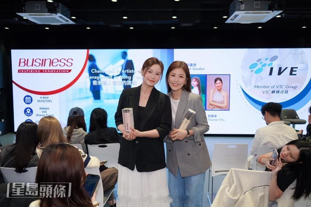 TVB选美冠军朱晨丽与艺人赵璧渝(Osanna),早前到香港专业教育学院 IVE(观塘),为“BUSINESS INSPIRING INNOVATION-香港艺人管理的挑战”担任客席讲师。在历时两小时的讲座,与莘莘学子分享演艺生涯,也谈及初入行时种种困难及挑战。