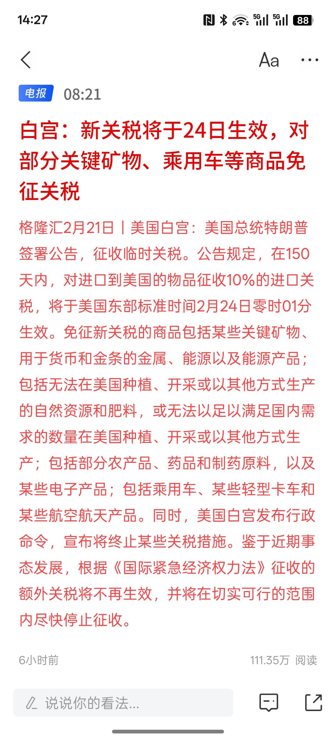 春节过后,新能源汽车可能会上涨,白宫:新关税将于24日生效,对部分关键矿物、乘用车等商品免征关税!现在美国需要新型能源的发展,所以美国对这些部分产品减免了关税!新型能源减免了关税!特朗普最近说要访问中国,可能在3月份左右到4月份!那么,中美贸易未来还有很大的空间可以谈判! 我国的新能源汽车在全球范围内技术越来越先进!