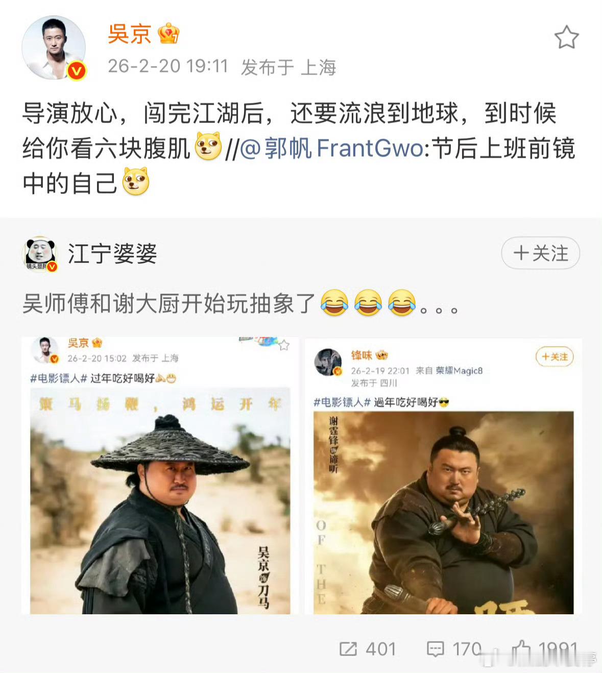 吴京怎么跟谁都显得很暧昧啊前脚对着谢霆锋说“我的夫人姓谢”后面就转发郭帆微博说“给你看六块腹肌”