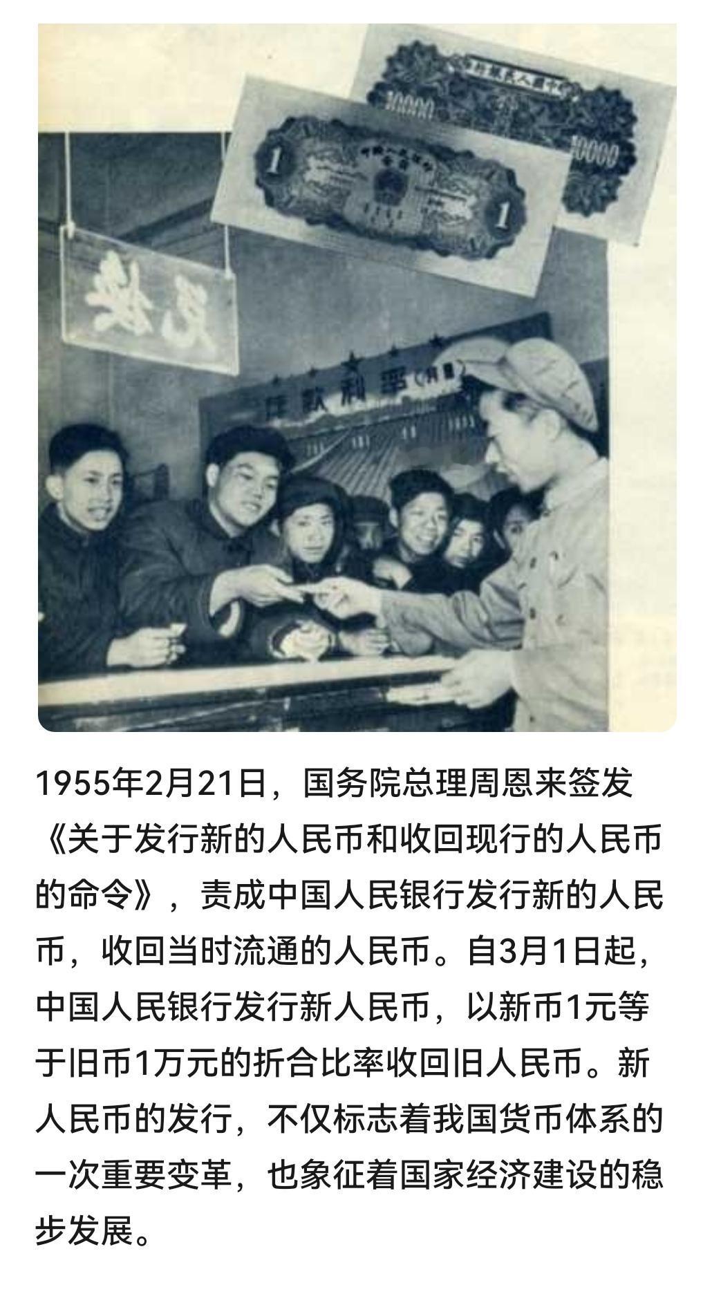 #建国丰功伟绩 历史上的今天:1955年2月21日,国务院总理周恩来签发《关于发行新的人民币和收回现行的人民币的命令》,责成中国人民银行发行新的人民币,收回当时流通的人民币。自3月1日起,中国人民银行发行新人民币,以新币1元等于旧币1万元的折合比率收回旧人民币。新人民币的发行,不仅标志着我国货币体系的一次重要变革,也象征着国家经济建设的稳步发展。