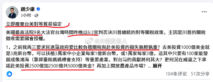 台北,黎少康勇起来了(图1)要求赖皮德集团,立即废弃“台美对待贸易协定”先不说这个协定是不是真正“对等”,只是,少康这么勇,不敢自己直接去AIT美国在台协会单位门前骂街吗?美国在台协会大院,就在台北呀,离少康不远呀美国或需退还1750亿美元关税,特朗普暗示违法征收的关税不退了,特朗普称最高法院裁决可耻荒谬,美最高法院裁定特朗普关税违法,热点观点