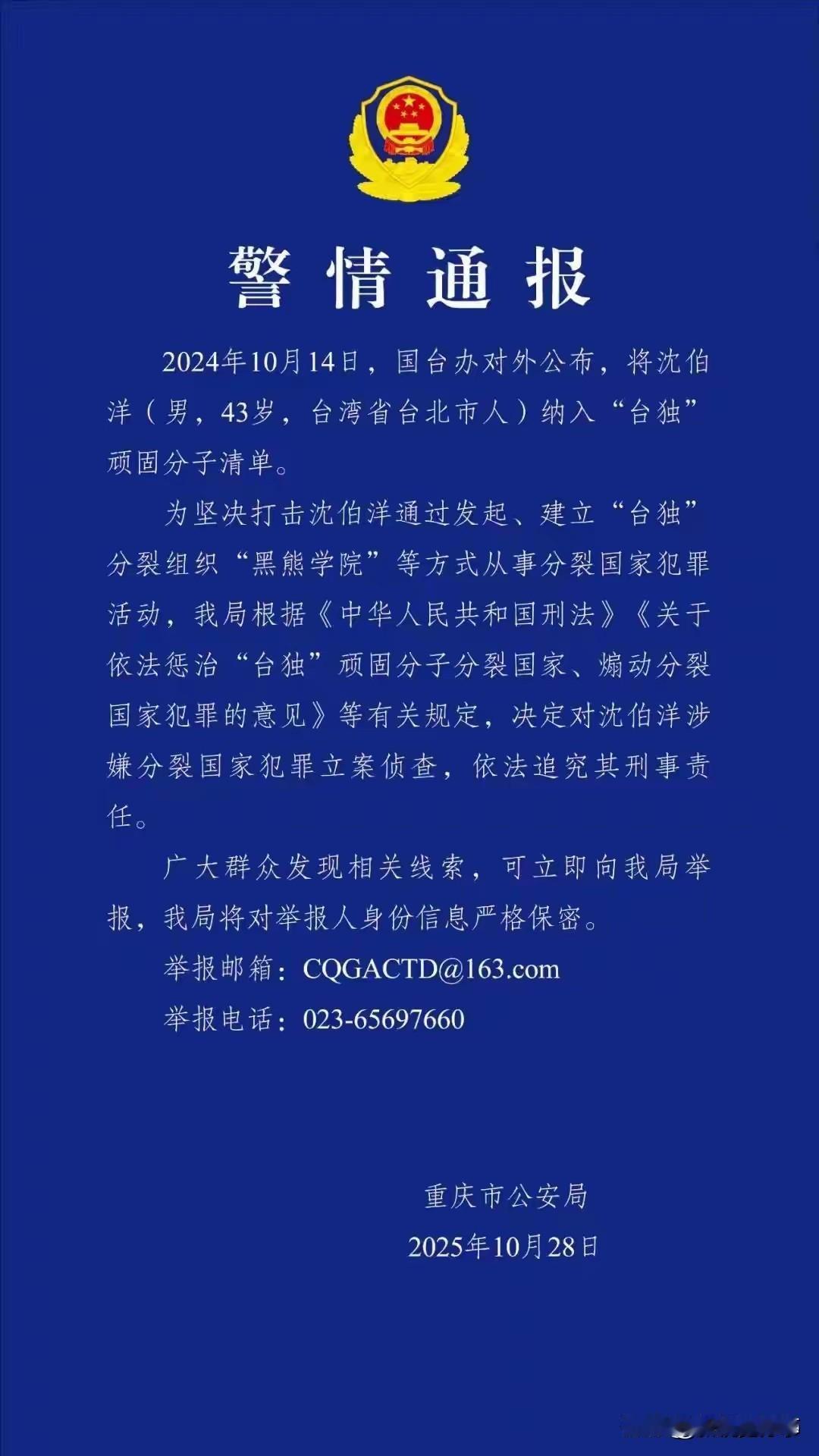 通缉120天!沈伯洋执迷不悟,必将付出代价…… 大年初三,沈伯洋被依法立案侦查已满120天。 他不仅没有半点悔改,反而在分裂国家的路上越走越远。 可能很多朋友对沈伯洋这个名字不算熟悉,咱们先掰开揉碎了说清楚。这个人是岛内长期搞分裂活动的,这些年没少干破坏两岸关系的事,甚至还忽悠岛内的普通老百姓,搞什么所谓的民防培训,说白了就是想把普通人推到前面,给他的分裂勾当当炮灰。 咱们先算笔明白账,120天,整整四个月的时间。从被依法立案侦查那天起,相关部门就已经掌握了他违法犯罪的实据,也给了他主动投案、悔过自新的机会。但凡他有一点敬畏法律的心思,有一点回头的想法,都该趁着这个机会主动交代问题,争取宽大处理。可他倒好,四个月里不仅半点收敛都没有,反而变本加厉,在分裂的歪路上越走越远,完全是不见棺材不落泪。 咱们都清楚,台湾自古以来就是中国的领土,两岸同胞都是一家人,打断骨头连着筋。国家一直抱着最大的诚意推动两岸和平往来,就是不想看到同胞起冲突,不想让岛内老百姓受牵连。可沈伯洋这类人,偏偏为了自己那点私利,不惜勾连外部势力,干着损害国家利益、伤害同胞感情的事。他们总以为靠着外部势力撑腰就能为所欲为,却不想想,人家从来只是把他当棋子,有用的时候拿出来晃一晃,没用的时候说扔就扔,根本不会真的为他负责。 老祖宗早就说过,多行不义必自毙。从古到今,凡是敢分裂国家、背叛民族的人,从来没有一个有好下场。远的不说,近代那些投靠外敌、出卖国家的汉奸,哪一个不是被钉在历史的耻辱柱上,被世世代代的中国人唾骂?国家统一是历史的必然,是所有中国人的共同心愿,这不是任何分裂分子、任何外部势力能改变的。 咱们国家的法律从来不是摆设,对于分裂国家的犯罪行为,我们有明确的规定,更有足够的能力和决心,把所有违法者绳之以法。不管你躲到哪里,蹦跶得多欢,只要敢触碰分裂国家的红线,就绝对逃不掉法律的制裁。沈伯洋现在的执迷不悟,不过是最后的疯狂,早晚会为自己的所作所为,付出沉重的代价。 各位读者你们怎么看?欢迎在评论区讨论。
