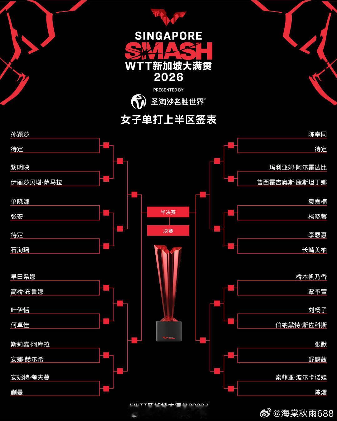 WTT新加坡大满贯女单抽签:孙颖莎蒯曼上半区 王曼昱张本美和下半区------北京时间2月20日,2026WTT新加坡大满贯抽签仪式进行。女单方面,孙颖莎首轮对手待定,蒯曼对阵考夫蔓,上半区国乒女单多达7人;下半区王曼昱对阵曾尖,或在1/4决赛遭遇张本美和。 网页链接