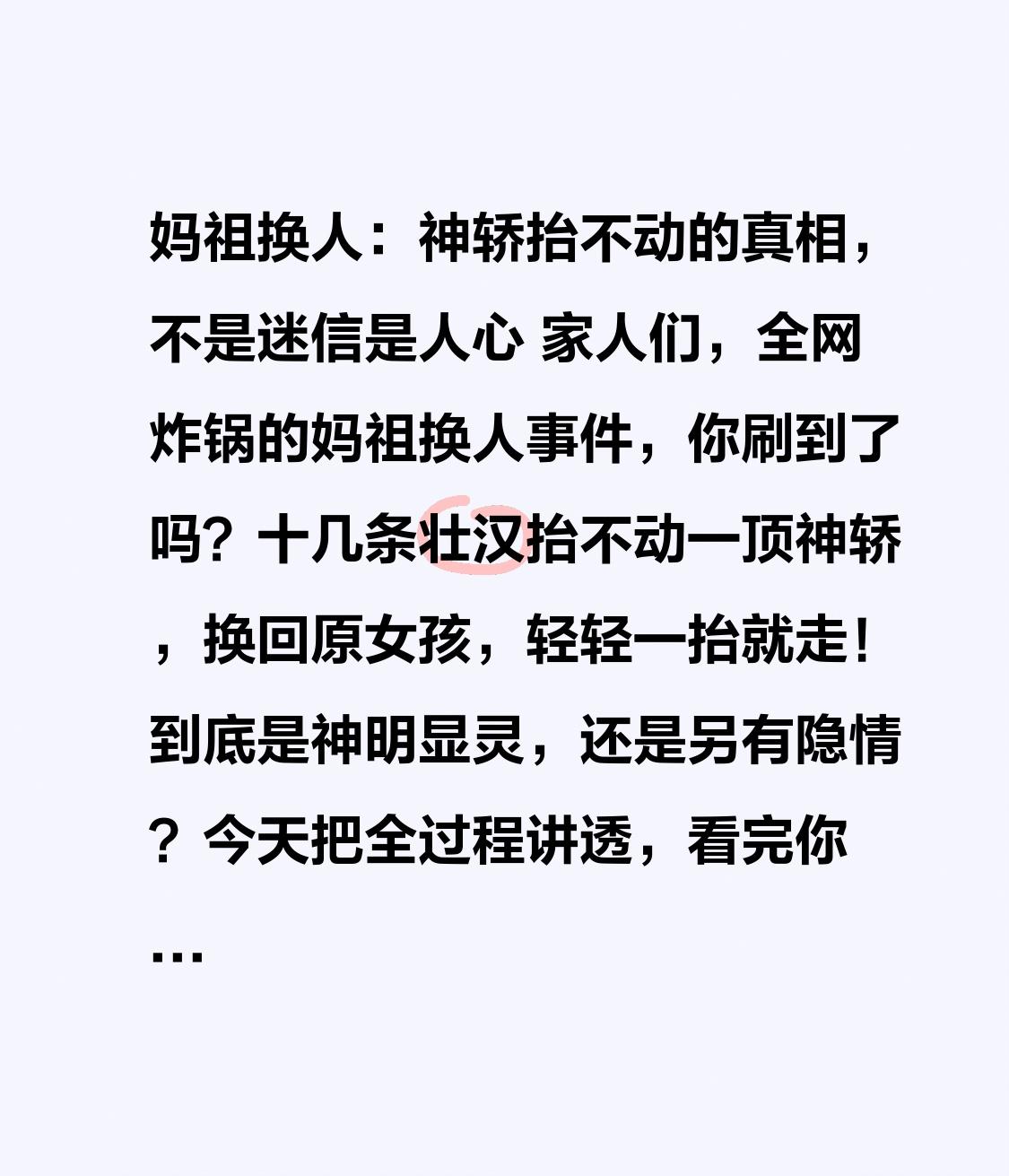 妈祖换人:神轿抬不动的真相,不是迷信是人心 家人们,全网炸锅的妈祖换人事件,你刷到了吗?十几条壮汉抬不动一顶神轿,换回原女孩,轻轻一抬就走!到底是神明显灵,还是另有隐情?今天把全过程讲透,看完你就懂:人心不可欺,规矩不可破! 大年初二,广东湛江拾石村一年一度妈祖巡游,吉时已到、锣鼓齐鸣。按百年民俗,妈祖童女需经掷圣杯选定,心诚、缘定、村民公认。红衣女孩连续多年担任,流程稳、掷杯灵,是全村公认的合适人选。 可就在上场前,有人仗着出资、托关系,未经请示、不掷圣杯、强行换人,把自家孩子推上去,把原定女孩硬生生换下。现场老人极力阻拦,却挡不住私心作祟,所有人都捏了一把汗。 离谱的事紧接着发生:新换人连续掷杯,次次不吉;平时几人能抬的神轿,此刻像钉在地上,十几个壮汉憋红青筋、用尽蛮力,轿子纹丝不动!吉时将过,仪式卡死,几百人围得水泄不通,有人慌了神,有人骂不守规矩。 就在进退两难、场面失控时,长辈当机立断:把原女孩请回来! 女孩委屈归位,只一次掷杯,圣杯应声落地;众人抬手,神轿稳稳升起,巡游顺利重启。那一刻,全场沸腾,掌声雷动,所有人心里的石头终于落地。 很多人说这是灵异,其实根本不是。妈祖信的是慈悲,守的是公道,敬的是人心。老祖宗的民俗,讲的是诚心、公平、敬畏。你随意改规矩、抢位置、失了人心,再大力气也抬不动一顶轿;人心归位、诚心到位,不用蛮力也顺风顺水。 钱能买香火,买不到神明认可;能换人选,换不来顺遂平安。民俗不是儿戏,信仰不能功利,敬畏心丢了,再热闹的仪式也是空架子。 这件事给所有人提个醒:不管做人做事,守规矩、存善心、讲公道,才是最大的福气。举头三尺有神明,不欺人、不欺心,福气财气自然来。 刷到这条视频,愿你心怀敬畏、行有所止,平安顺遂、万事胜意、所求皆如愿!