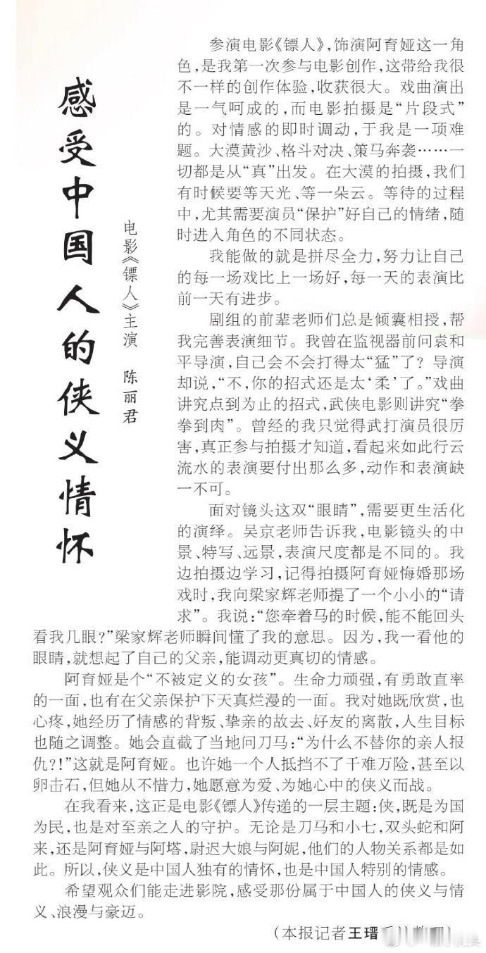 陈丽君《镖人》采访登上《人民日报》,《感受中国人的侠义情怀》提到阿塔牵马回头看阿育娅的剧情是陈丽君的建议,这一设计升华了父女线的情感!就喜欢有脑子会思考的演员👏