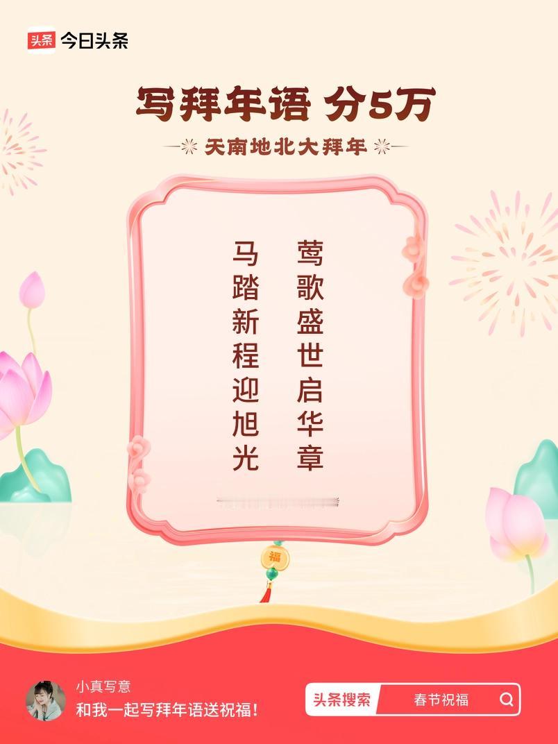 写拜年语送祝福新春拜年送祝福!我的祝福是:“马踏新程迎旭光,莺歌盛世启华章”!快来一起写祝福吧戳这里,一起领红包>