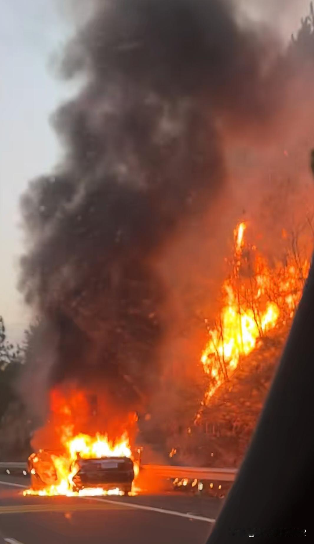 昨天去赣州市区的高速路上,马上要到关西围屋景区的高速路上,一辆车自燃了,把旁边的山体也引燃了
