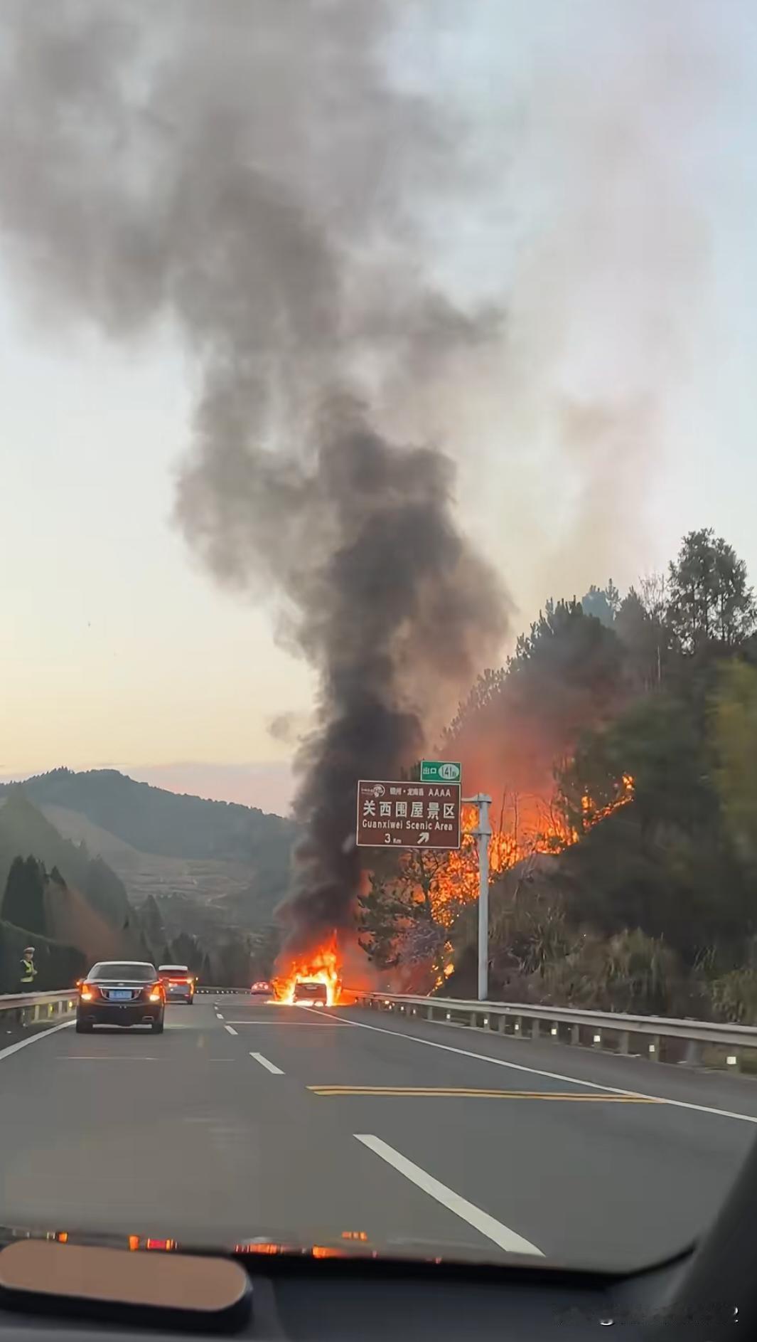 昨天去赣州市区的高速路上,马上要到关西围屋景区的高速路上,一辆车自燃了,把旁边的