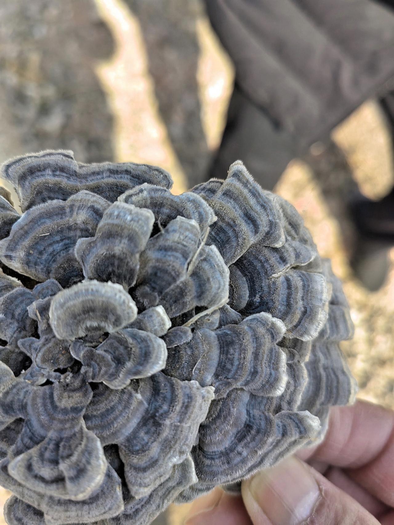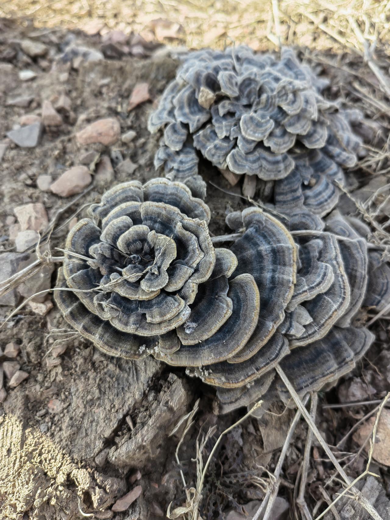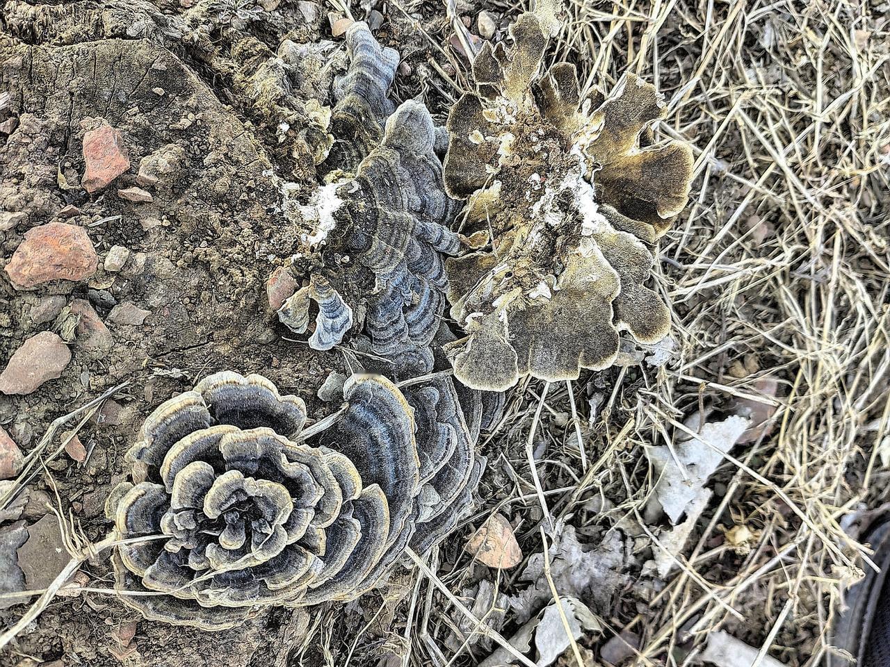 忙了几天了,终于得闲,出去走走吧,呼吸一下新鲜空气。 迎着暖暖的春风,漫步在田埂土路上,心情格外舒畅! 无意中,还有惊喜发现:路边霉烂的树墩子上,这是长了个啥东西? 一圈儿一圈儿的灰色花纹,有序围绕着,形似一朵盛开的花,是野生灵芝吗?