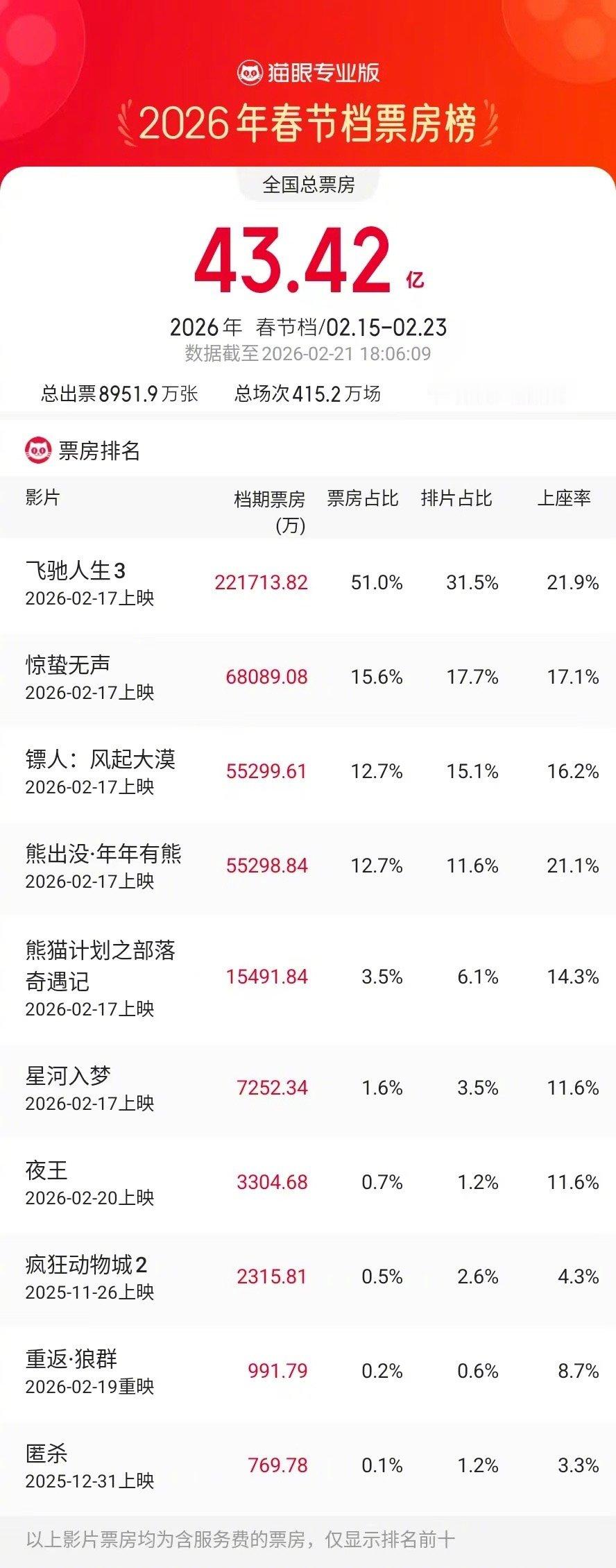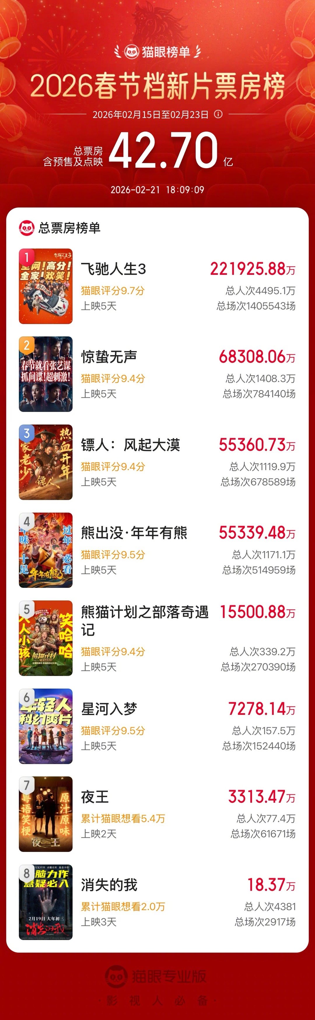 镖人春节档票房超熊出没 据猫眼专业版数据,截至2月21日18时06分,《镖人:风起大漠》春节档总票房破5.52亿,超《熊出没·年年有熊》春节档票房成绩,进入春节档票房榜前三。春节档马上有戏