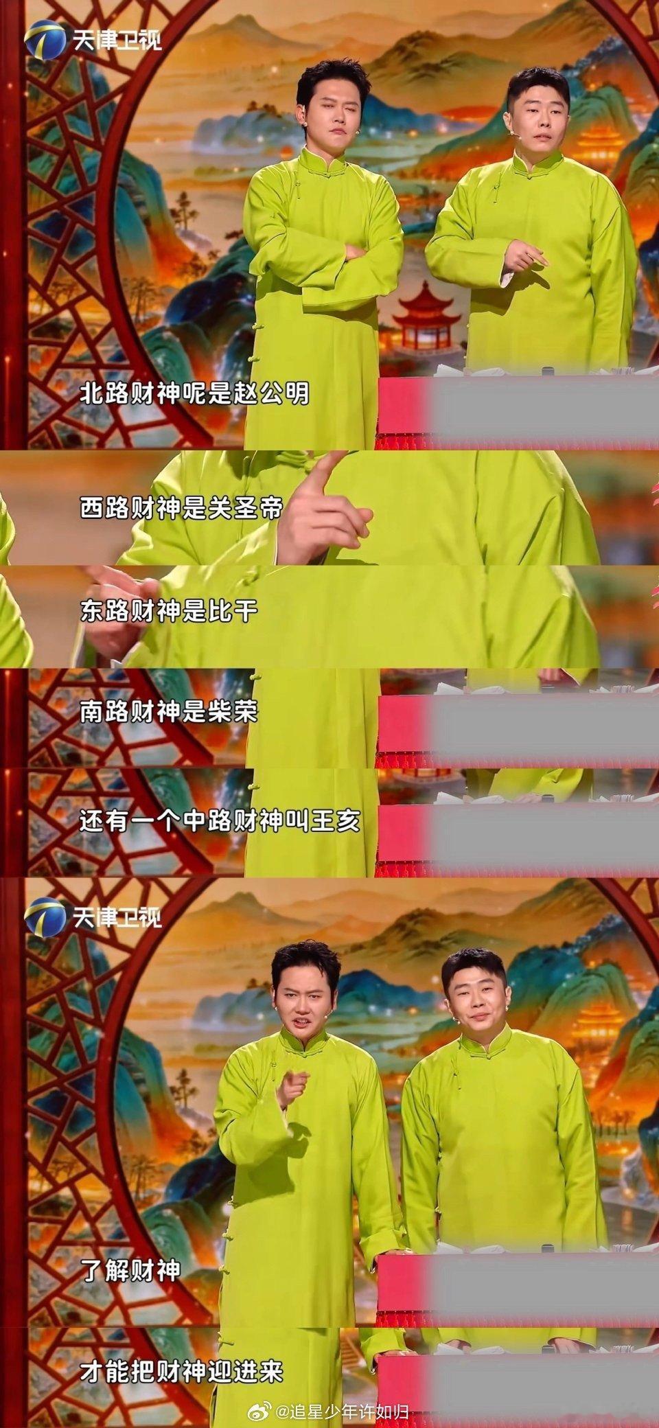 初五迎财神还得看孟鹤堂周九良天津卫视相声春晚 孟鹤堂周九良这波迎财神操作,属于是反向操作了。别人求财神,他俩伺候财神。加buff、配太监、找陪练,一套下来财神爷怕是感动得不想走。