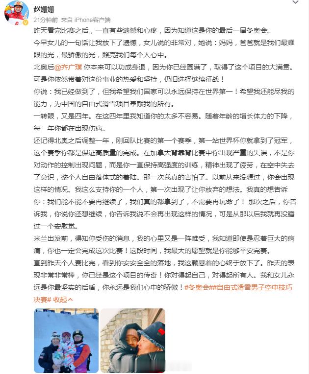 齐广璞妻子长文太好哭了齐广璞是家人最耀眼的光 齐广璞妻子赵姗姗更新社媒发文: 北奥后你本来可以功成身退,因为你已经圆满了,取得了这个项目的大满贯。可是你依然带着对这份事业的热爱和坚持,仍旧选择继续征战!你已经是这个项目的传奇!你对得起自己,对得起所有人。我和女儿永远是你最坚实的后盾,你永远是我们心中的骄傲!全民聊冬奥