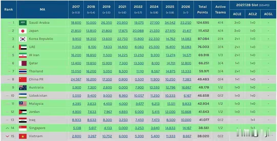 中超,现在的样子真的很狼狈! 当我们还在为联赛冠军争得头破血流时,亚足联的积分表已经把底裤扒得一干二净。7.383分,东亚区第9,总排名第15,连新加坡、马来西亚、越南都能骑在头上,这就是我们引以为傲的中超? 当年泰山拼川崎,好歹还能为联赛挣下2+2的亚冠名额,现在倒好,四支球队全军覆没,积分直接腰斩。有人说这是战略性放弃,为了联赛冠军蓄力,可“永争第一”的口号喊得再响,在亚冠赛场上连还手之力都没有,这第一争得又有什么意义? 无限外援政策、跨年赛程成了遮羞布,可人家新马泰、印尼越南怎么就能在同样的规则下把积分甩我们十条街? 别再自欺欺人说什么“真实实力不止于此”,当联赛变成了窝里横的角斗场,当球队把亚冠当成可有可无的鸡肋,被超越、被淘汰,不过是时间问题。 再这么混下去,别说亚冠精英赛,恐怕连二级联赛的名额都保不住,到时候只能去三级挑战联赛找存在感。 到那时候,再喊“永争第一”,恐怕只会沦为整个亚洲足坛的笑柄。