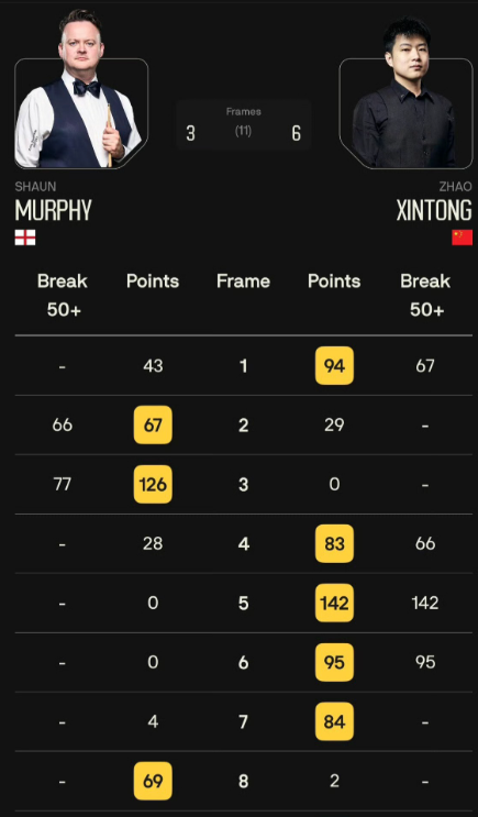 昨晚的一场2026斯诺克球员锦标赛1/4决赛,墨菲VS赵心童,墨菲0-1、2-1领先、半场2-2平;休息回来赵心童连续打出一杆制胜:142、95、118,6-3淘汰墨菲晋级半决赛。