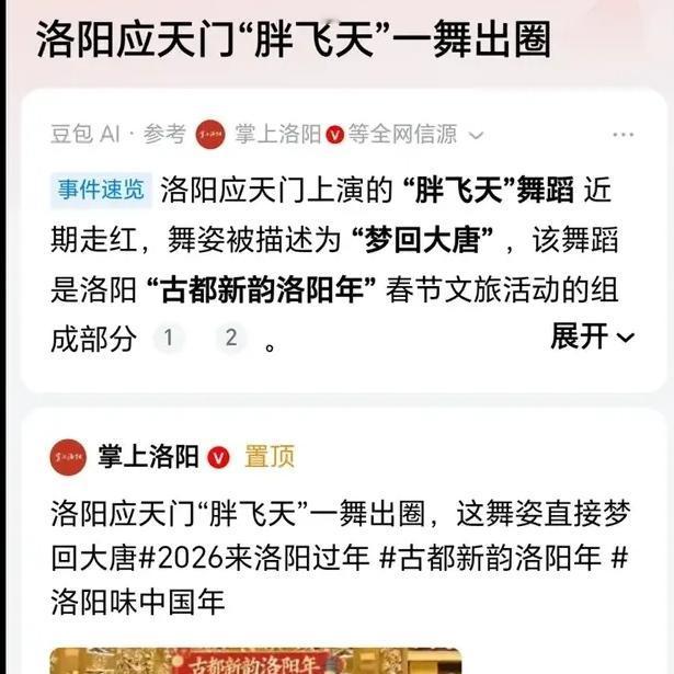 洛阳文旅估计都偷着乐, 谁能想到“胖飞天”一飞冲天, 直接把应天门送上热搜,成了春节顶流! 2026春节,应天门的胖飞天彻底火出圈,不跟风白瘦审美,实打实还原唐代丰腴之美。 珠圆玉润、衣袂飘飘,和千篇一律的瘦飞天形成强烈反差,一眼就惊艳全网。 现在很多人被极端瘦审美绑架,总觉得越瘦越好看,反而忘了健康舒展才是真的美。 洛阳这波太清醒,不搞流量套路,尊重历史也尊重多元审美,丰满灵动的姿态,才是活过来的大唐神韵。 文旅拼到最后,拼的是文化与态度,这波热度接得又稳又高级。 你更喜欢这种丰腴的大唐飞天,还是传统瘦飞天?隋唐洛阳应天门 洛阳文旅 洛阳应天门夜宴 应天门跳舞 洛阳粒应天门 洛阳市文旅 国风洛阳