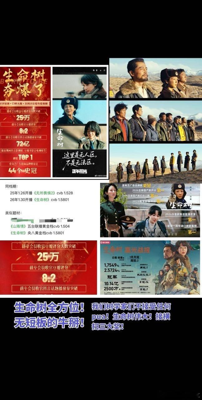 生命树作为第一部环保题材正剧,严肃题材剧集,播出周期短的情况下,德塔文景气指数破2.5,25万人打出豆瓣8.2的高分,抖音话题播放量破70亿,可见讨论度爆棚,口碑质感权威。