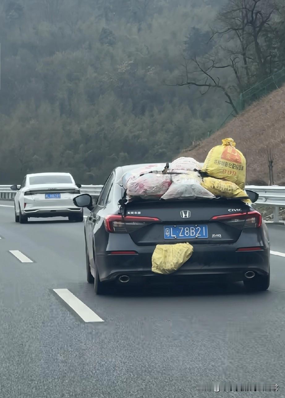 这才是妈妈的爱,看完破防了 今天在G4京港澳高速上,看到前面这辆粤L思域,我直接笑出眼泪又瞬间破防。 后备箱塞得满满当当还不够,连车顶都堆起了小山:黄的、粉的、白的编织袋,连车牌上方都挂着一个,活像个移动的“年货小山”。 评论区一句“父母:孩子走后总感觉家里空落落的呢”,瞬间戳中了我。是啊,哪有什么后备箱不够用,只是爸妈觉得你在外面吃不好、穿不暖,恨不得把整个家都给你打包带走。 虽然这种堆车顶的行为确实危险,可这沉甸甸的爱,又有谁能拒绝呢? 你返程时,后备箱都被爸妈塞了啥?