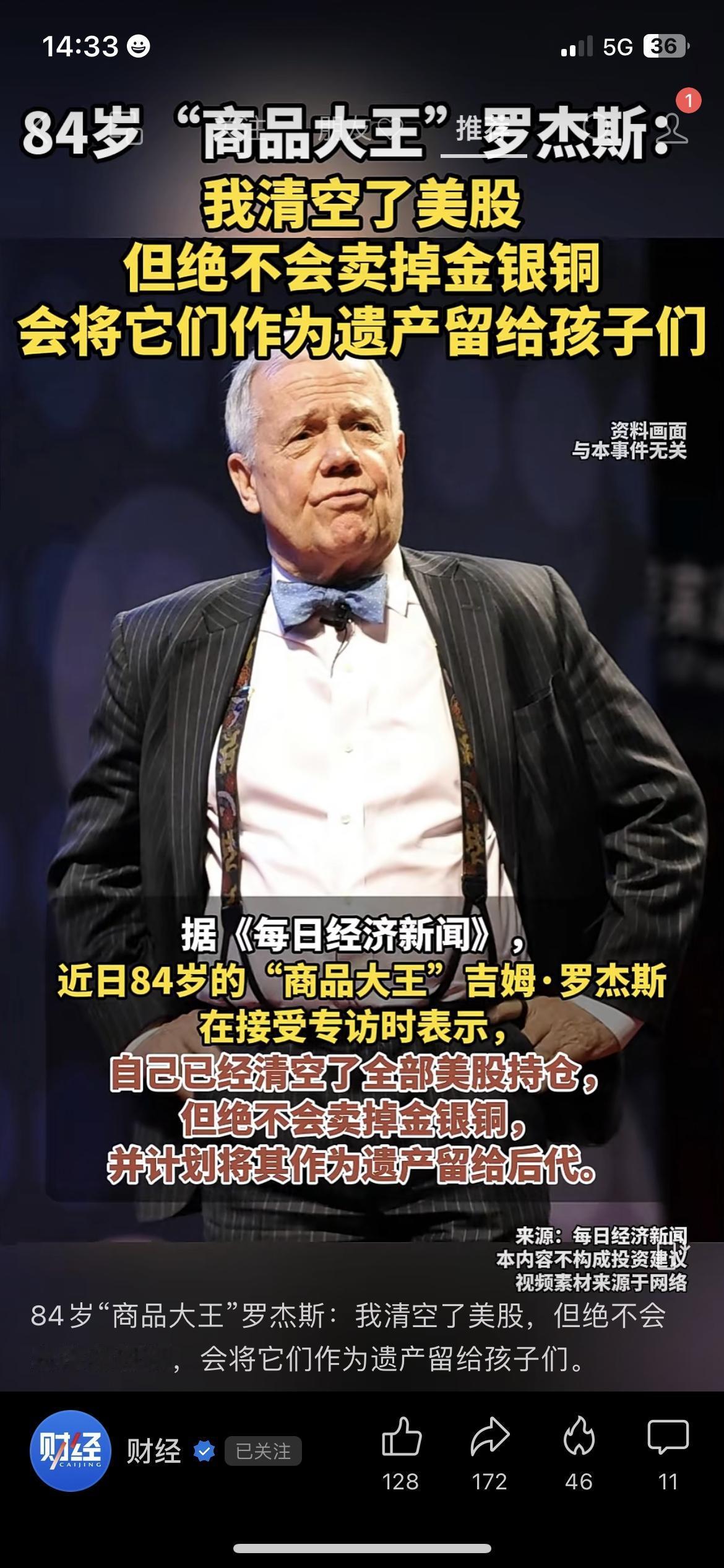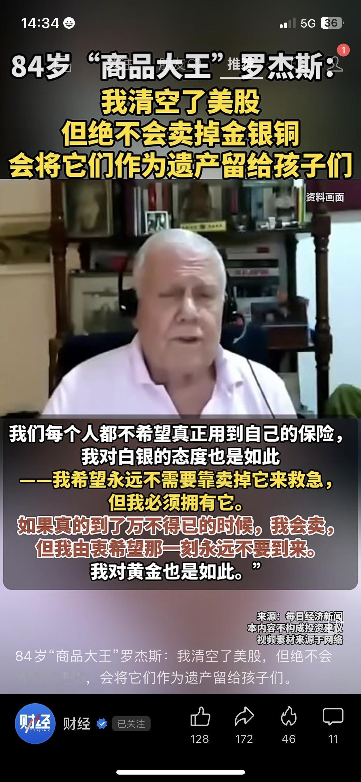84岁投资大佬罗杰斯,做出一个很明确的动作: 清仓美股,把黄金、白银、铜当成遗产留给孩子。 他说,黄金白银就像家庭保险,希望用不到,但一定要有。 我身边很多朋友,今年都开始配一点黄金ETF。 不图暴利,就图个安心、抗波动、压舱子。 全球不确定越强,黄金这类硬资产就越重要。 你配置黄金类资产了吗? 罗杰斯 黄金投资 资产配置