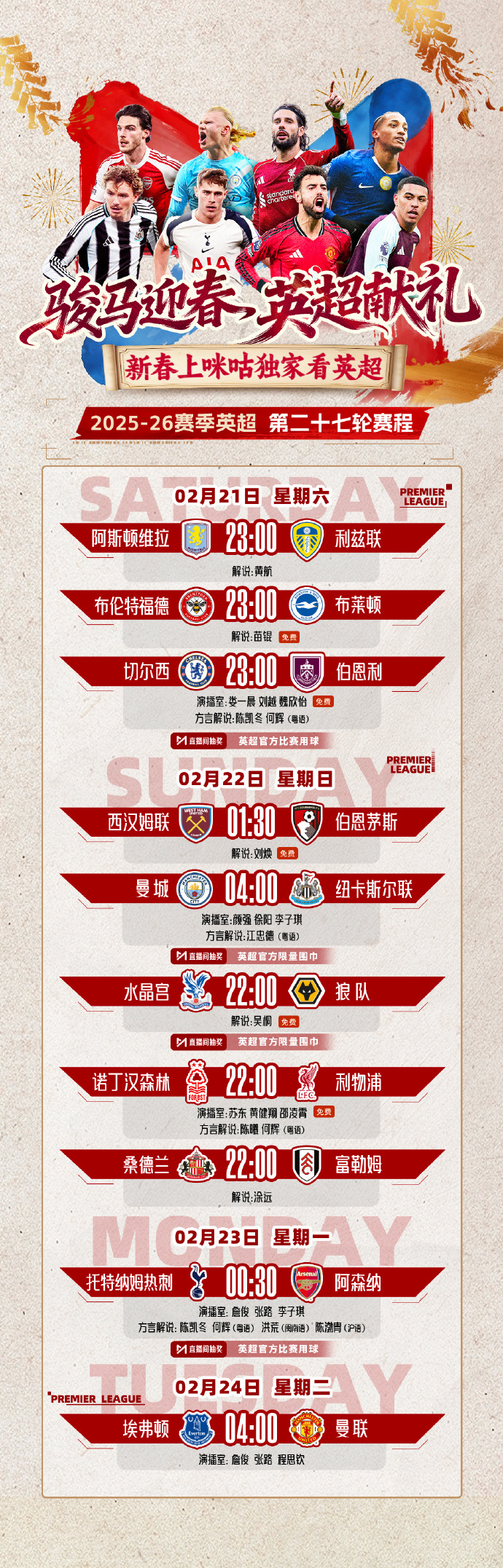 #新春尽享五大联赛只在咪咕# 🦁 𝗣𝗿𝗲𝗺𝗶𝗲𝗿 𝗟𝗲𝗮𝗴𝘂𝗲 英超第二十七轮来袭📆 完整赛程及排播出炉✍️ 马年你对主队的期待是?