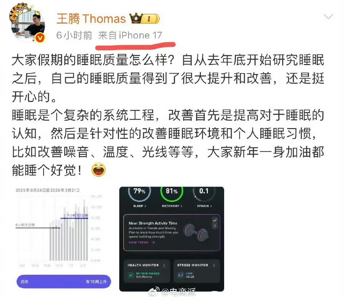 其分享睡眠质量改善的内容,发布设备显示为iPhone 17,这也是他自2025年9月离开小米后,首次公开使用非小米、红米系手机。