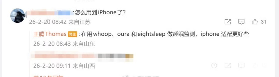 至于为何会换成iPhone,王腾也进行了回应:“在用whoop、oura和eightsleep做睡眠监测,iPhone适配更好些。”