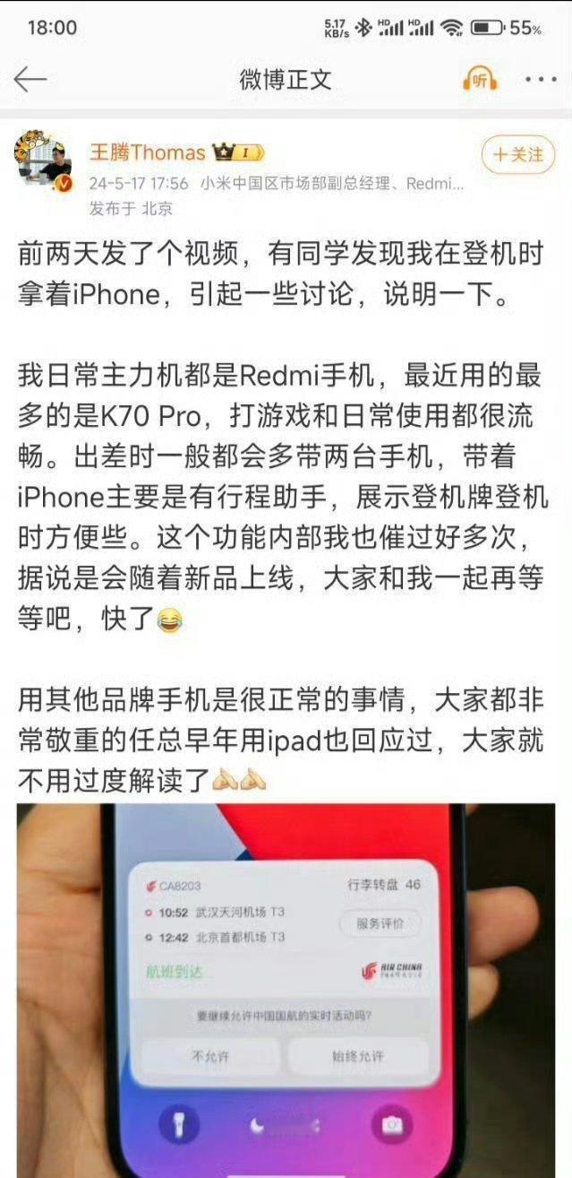 此前离开小米的近半年时间里,王腾始终坚持使用小米、红米旗下机型,此次更换设备的举动,让不少网友感慨爷青结。