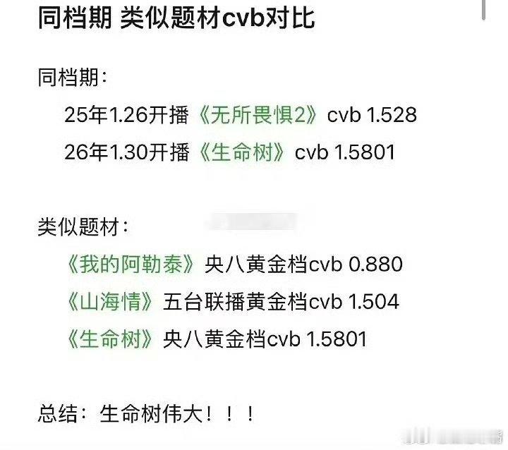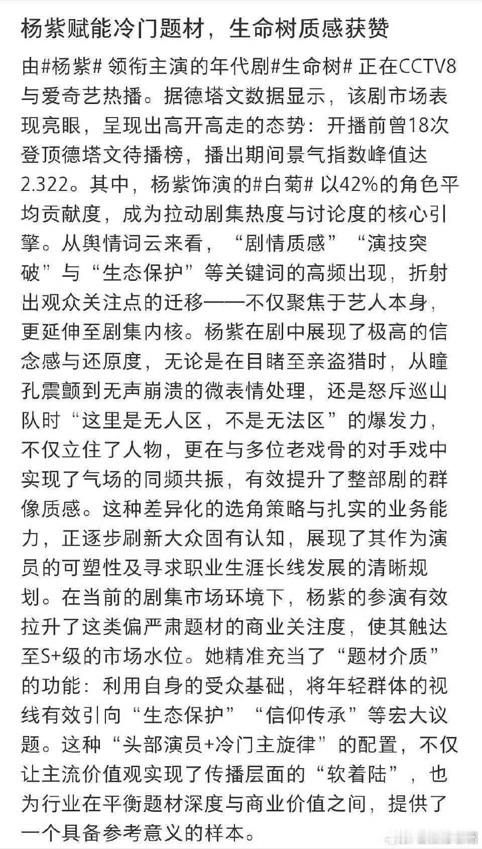 生命树的影响力持续发力《生命树》在小众题材里成绩很不错,cvb集均1.5801!短视频播放量破73亿,口碑爆剧广告爱奇艺史冠,业内发文杨紫赋能冷门题材 !
