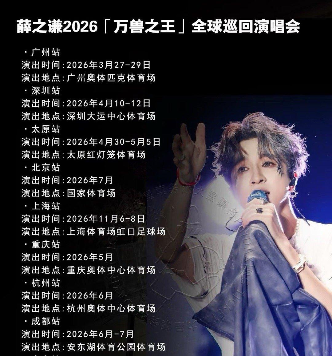 薛之谦给我留一张票看看你舞台有多大看到可能的歌单我就已经期待了,太想看了,薛之谦的歌我都很喜欢,那就记得时间吧:“万兽之王”巡回演唱会首站广州站即将开启预售(2月26日预售3月20日~22日/3月27日~29日、2月28日预售4月3日~5日)视听的双重升级,期待与你们最初的相见