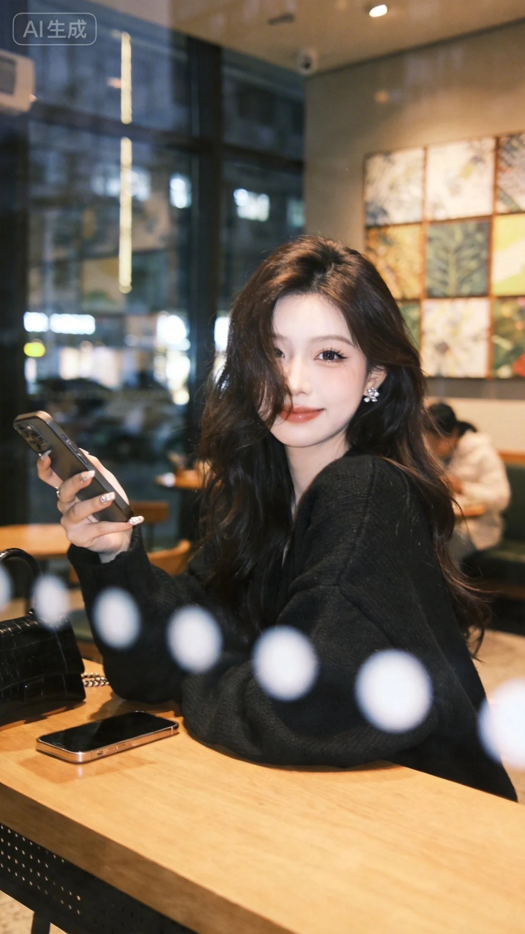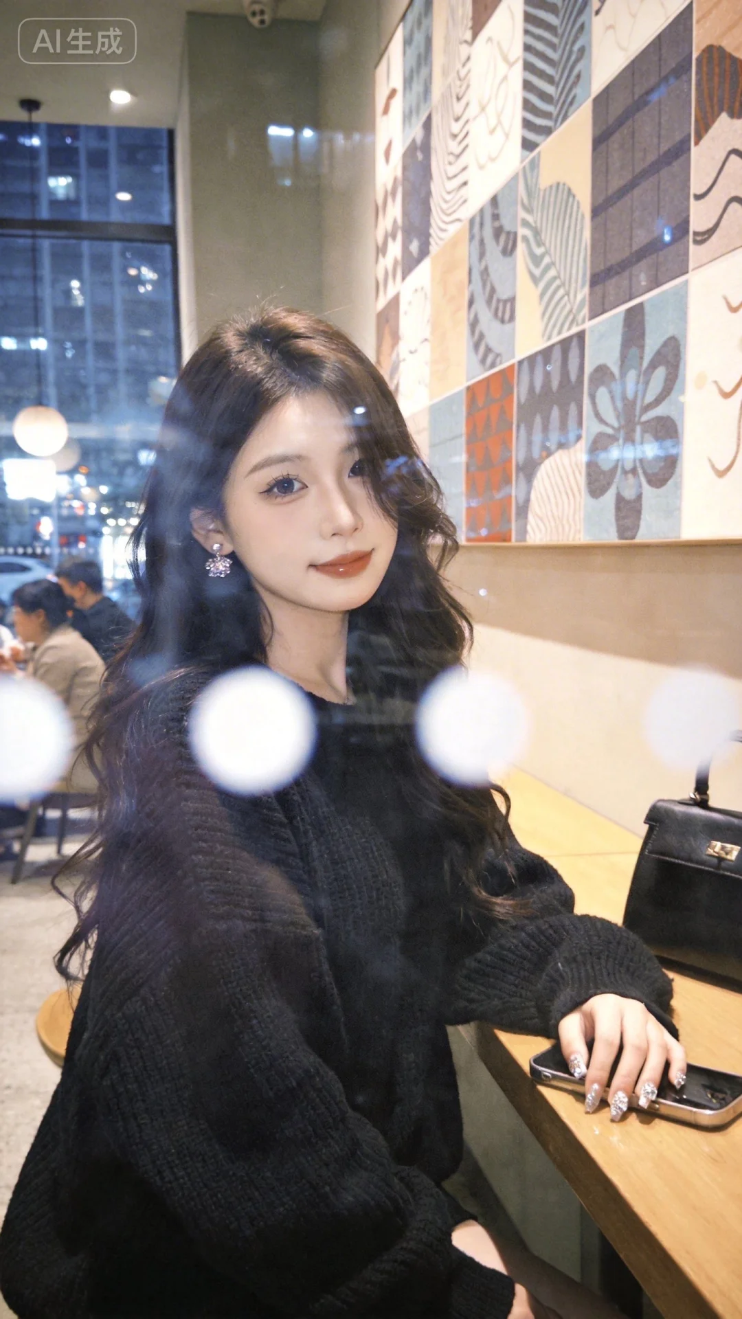 低饱和随手拍快照,反光的效果,低饱和度照片,瞬间抓拍感,前景隔着玻璃模糊遮挡,磨砂玻璃质感,透过玻璃看到:身处室内轻奢休闲场所,长卷发,发丝自然垂落脸颊,遮挡半边脸颊,妆容精致,眼神柔和,流露着轻松愉悦的情绪;身着纯黑色宽松针织上衣,一手持手机、一手搭在木质桌台,桌上还放有另一部手机与黑色包包;背景是装饰有拼接艺术画的墙面、玻璃窗外的城市夜景及店内其他顾客,整体环境温馨且具都市休闲氛围,画面光影柔和,突出人物主体的松弛感。。,随手一拍的快照,低分辨率,胶片,氛围感滤镜,网感头像,超高颜值美少女,网感头像,冷白皮,瓷白肌肤、奶油白肌肤,微醺,自然松弛,网感妆,自然光线,暖调滤镜,少女感网拍,概念风美学,情绪氛围感,聚焦眼睛,慵懒氛围感,脸部轻微曝光,像洋娃娃一样可爱,独特韵味的美,亮晶晶耳饰,亮晶晶美甲,可爱表情,深棕色唯美长发,随手一拍、抓拍,情绪具象、意境优先、氛围感主导,氛围感美学,低饱和氛围感、松弛慵懒感,微侧身,氛围感美女,抬头看镜头(不要多肢体 不要多手机)