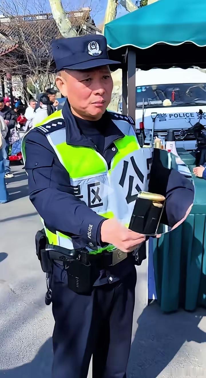 手枪里是有子弹的大年初一,杭州民警在西湖岸边执勤巡逻,维护着节日里的一方平安,对于游客枪里没有子弹的质疑很是不服气,他熟练地退出了腰间手枪的弹夹来,亮出了压满弹夹的明晃晃的真子弹,霸气的说道 : “谁说枪里沒子弹,没子弹挎个它有什么用,怎么来保护百姓、震慑罪犯,看清了,这是什么!”亮完真家伙后,“咔”的一声,他把弹夹重新磕进了手枪的枪柄中。