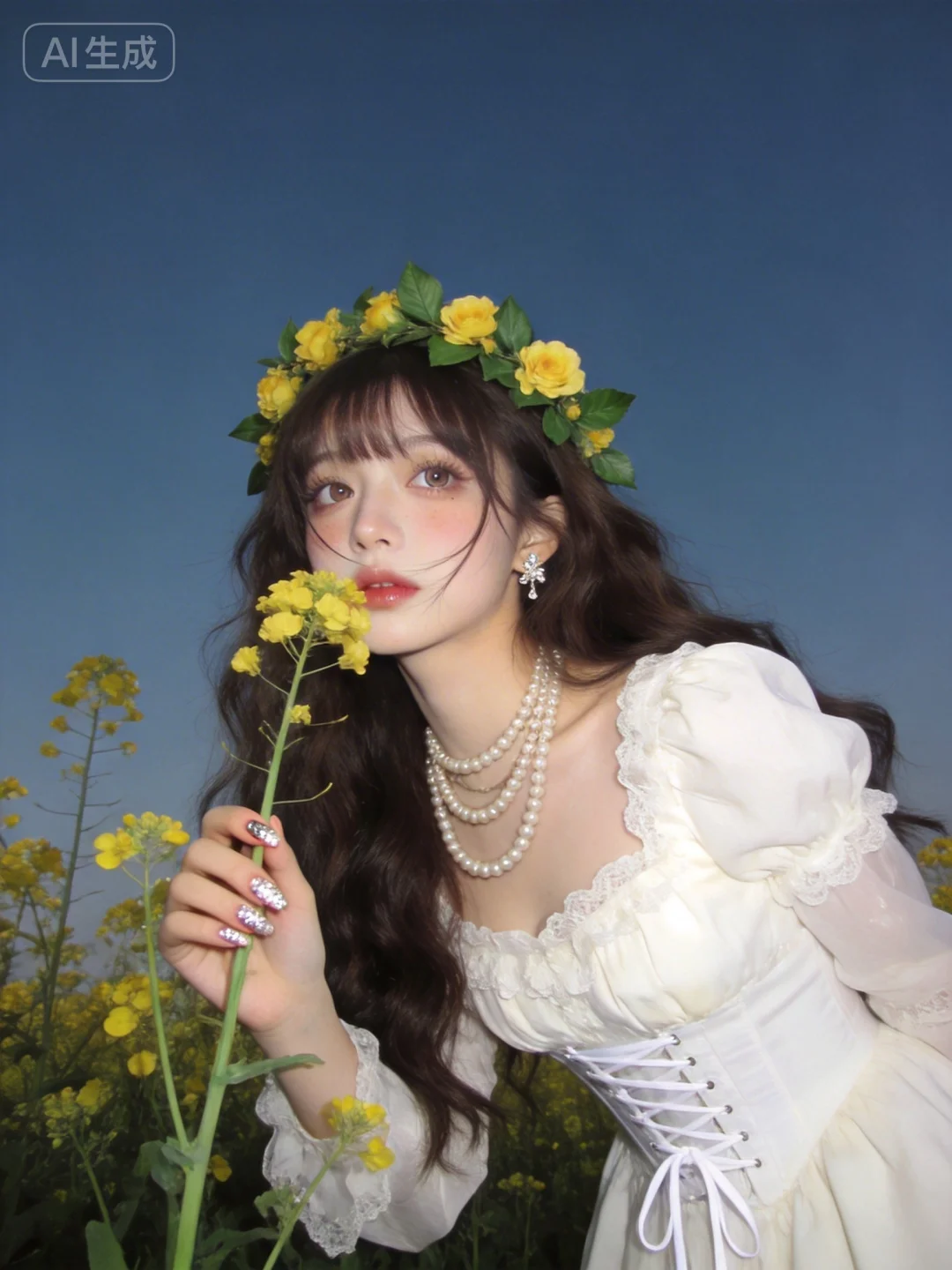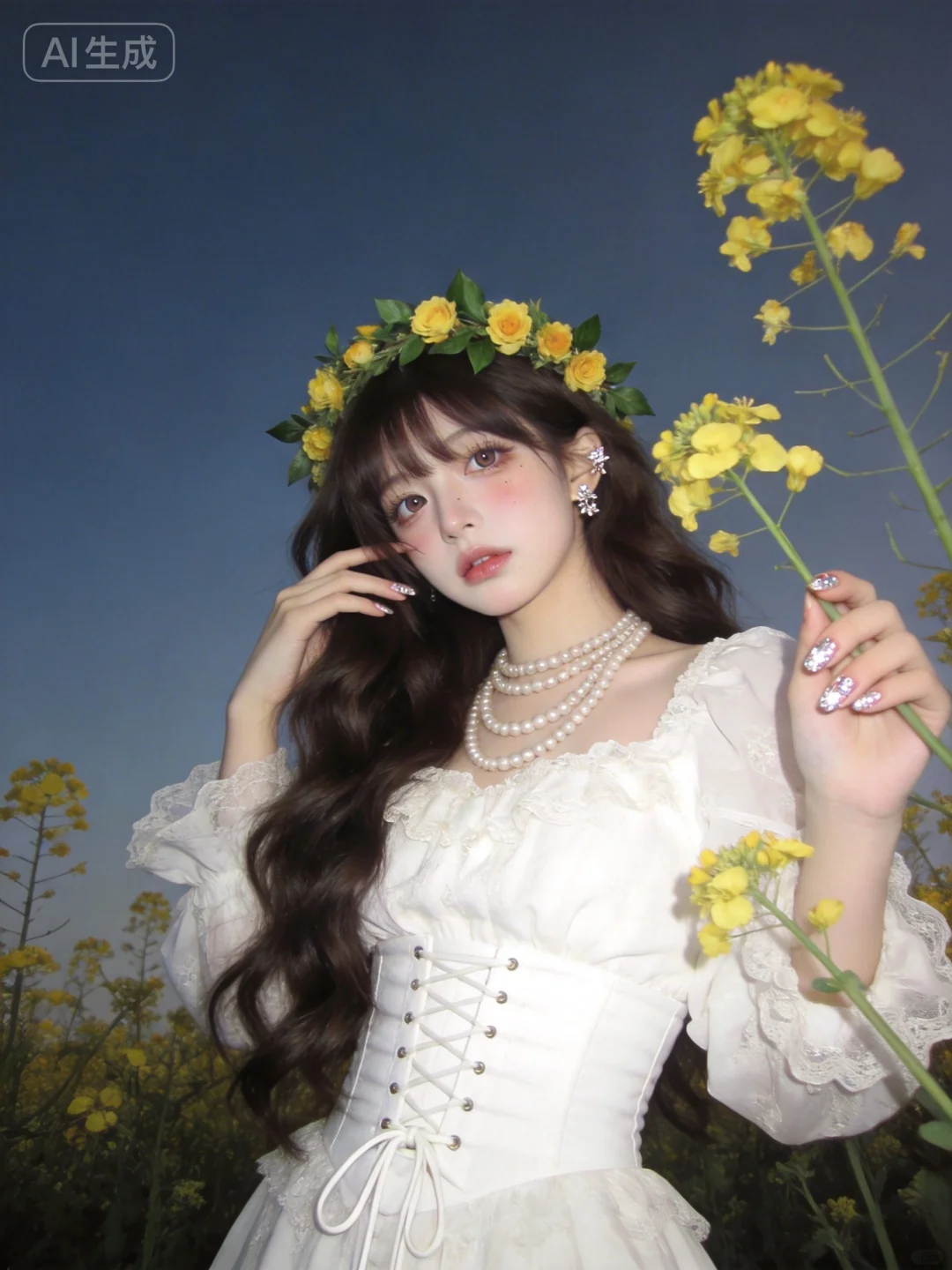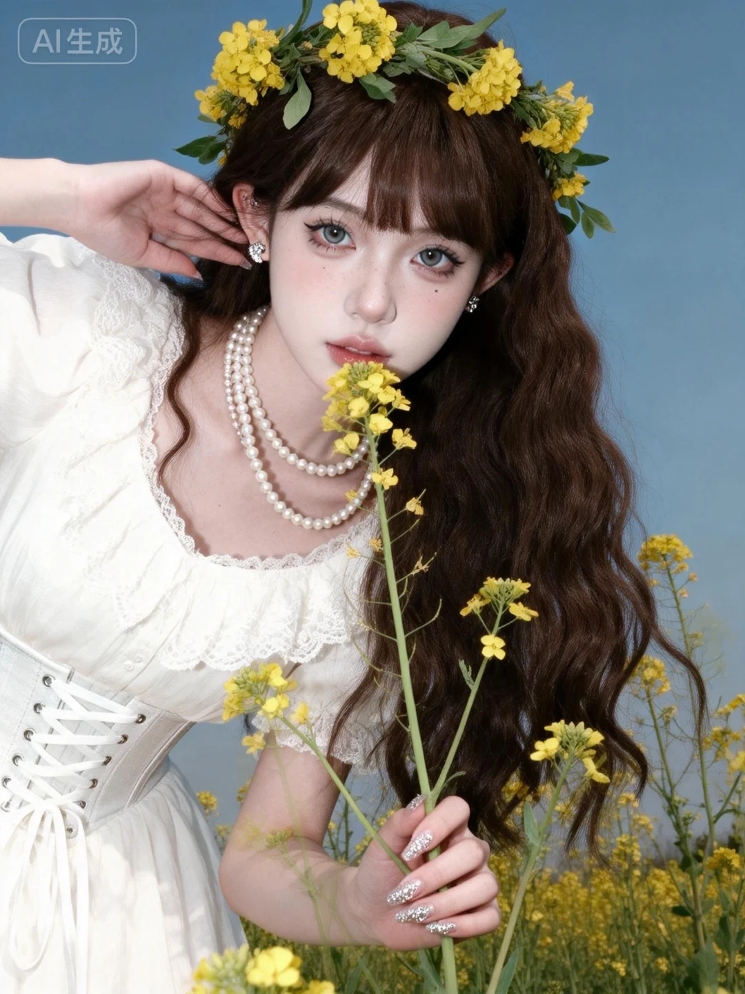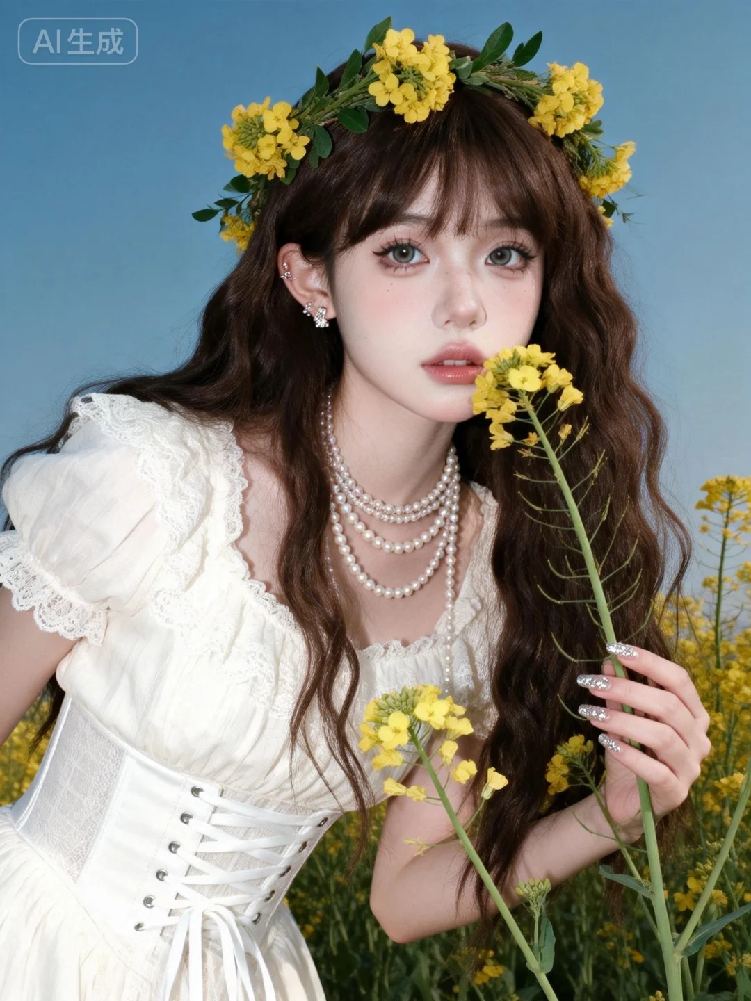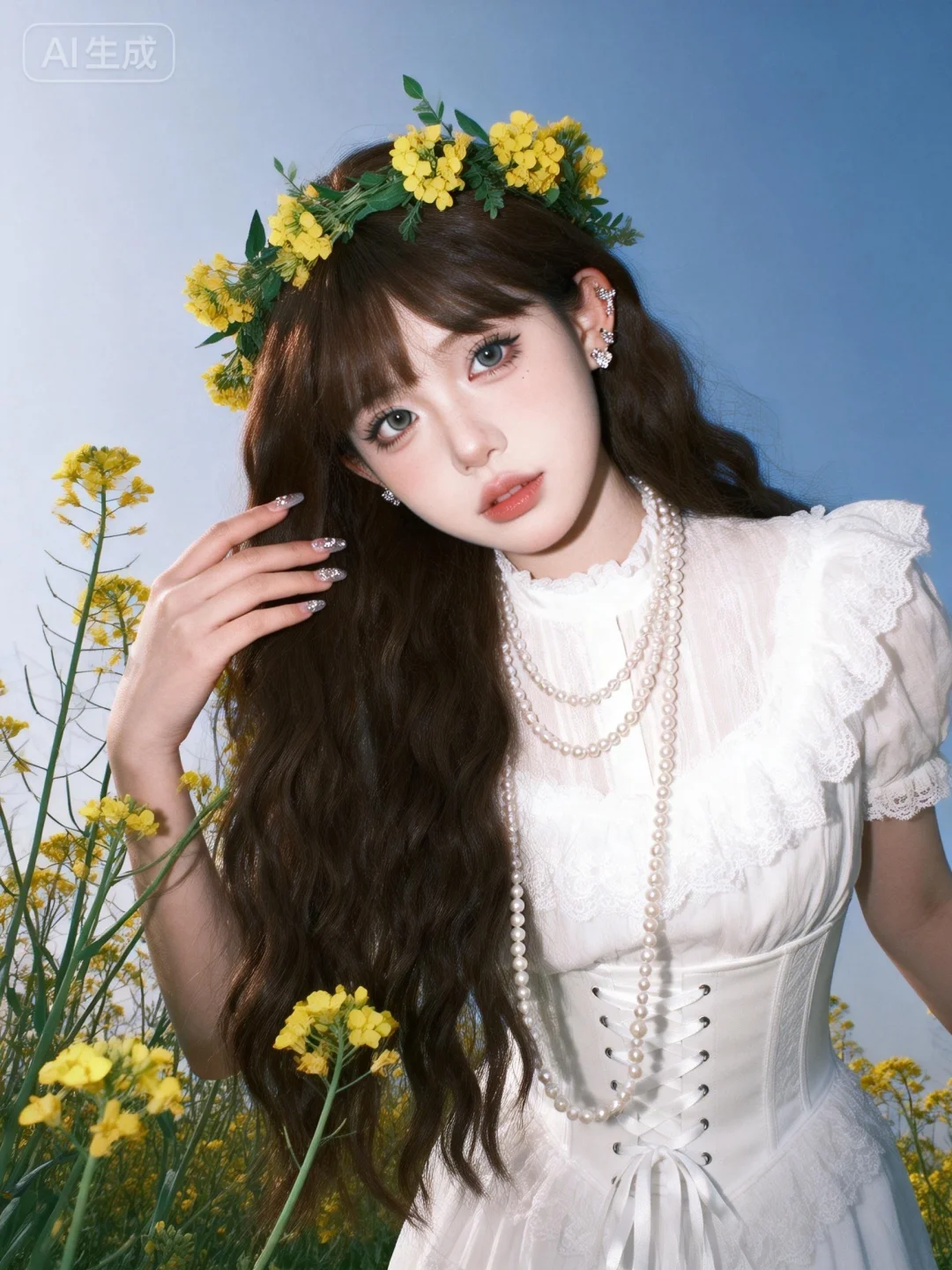 真实质感照片,现实生活中的照片,自拍真怼脸拍真实感照片,真实色调、原片直出、不加修饰、本色出镜、真实细节、原生细节、随手抓拍、自然状态 ,虚焦,抖动, 随手拍快照质感照片,人像摄影,超高颜值美少女,网感头像,远景,冷白皮,瓷白肌肤、奶油白肌肤,无辜大眼睛,微醺,自然松弛,像洋娃娃一样可爱,网感妆,自然光线,暖调滤镜,少女感网拍,概念风美学,情绪氛围感,聚焦眼睛,慵懒氛围感,脸部轻微曝光,独特韵味的美,发丝轻抚脸颊,亮晶晶耳饰,亮晶晶美甲,可爱表情,唯美长发,随手一拍、抓拍,极简留白、空境叙事、低饱和静谧、暗调沉敛、清透疏离,质感弱化、情绪具象、意境优先、简约克制、氛围感主导,氛围感美学,柔焦朦胧、光影氛围感、低饱和氛围感、松弛慵懒感、清透疏离感、暗调静谧感、暖调治愈感、空境松弛感、朦胧感、发丝柔光感,深棕色超长卷发垂落,头戴黄色花朵与绿叶编织的花环,身穿白色蕾丝宫廷风连衣裙,搭配多层珍珠项链,腰间是白色系带束腰,另一只手轻触油菜花茎,采用低角度仰拍视角,人物仿佛从花海中向镜头靠近,置身于大片油菜花田中,背景是澄澈的蓝天,午后明亮的自然光均匀洒下,光线通透干净,带着清新的空气感,整体氛围治愈又带着复古甜美的气息。微侧身