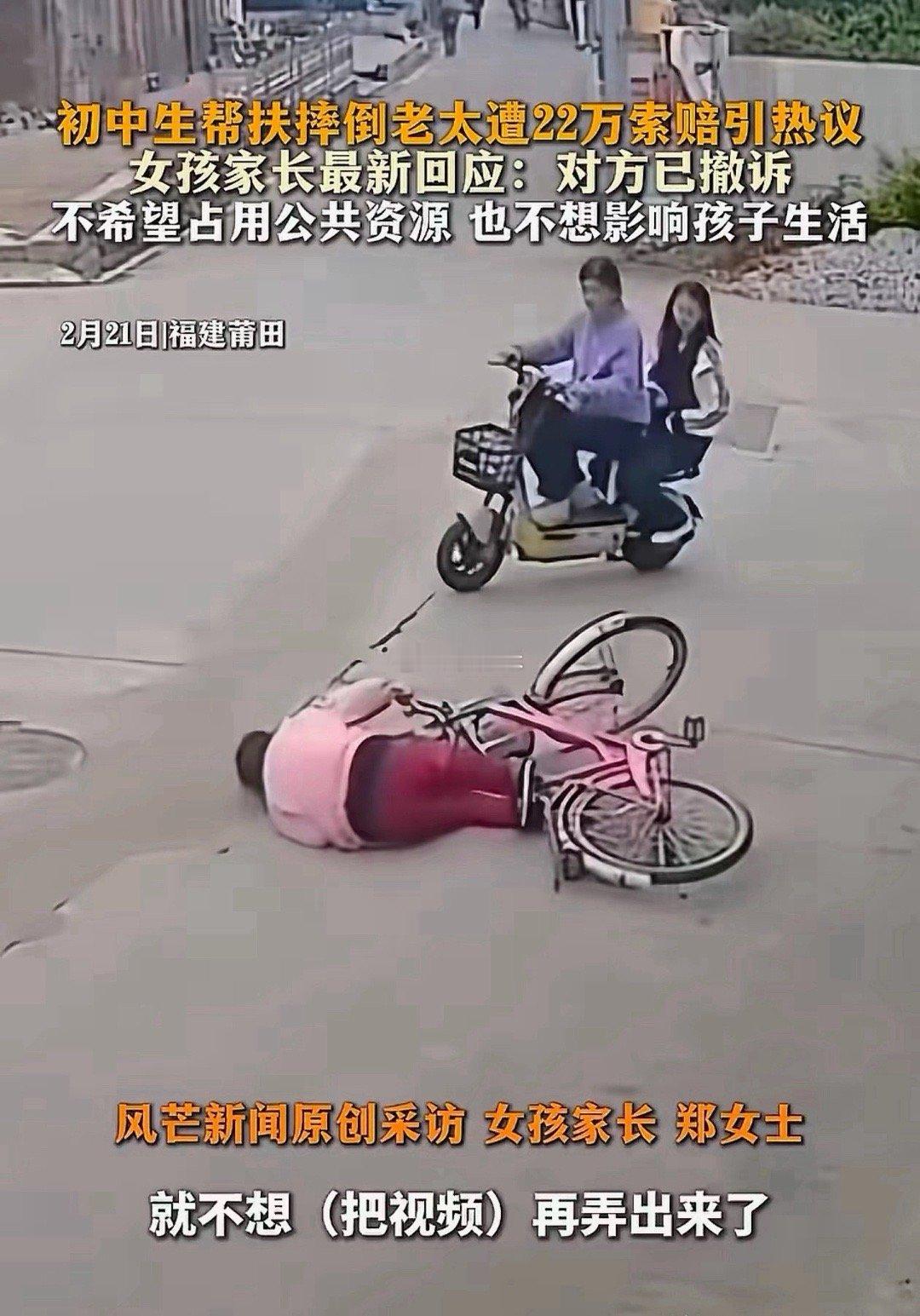 女生扶摔倒老人被索赔22万对方已撤诉这两天家里人吃饭也在谈论这个事,我有个妹妹想骑电动车上下学,家长坚决不同意,就拿这个事来举的例子,明明是出于本能的善良,却要被索赔22万,要面对舆论压力、心理阴影,最后家长为了孩子学业,只能妥协、删视频、息事宁人,甚至还要承担部分医药费。