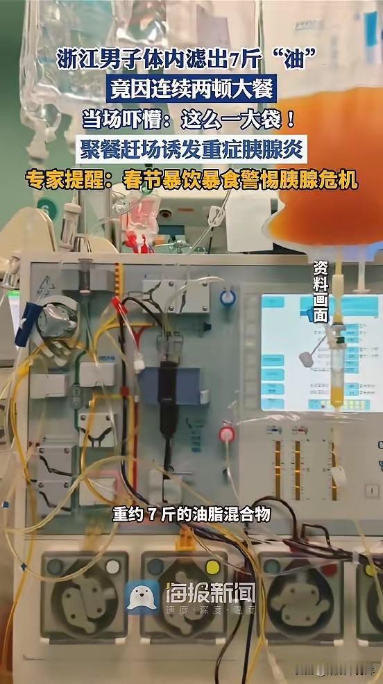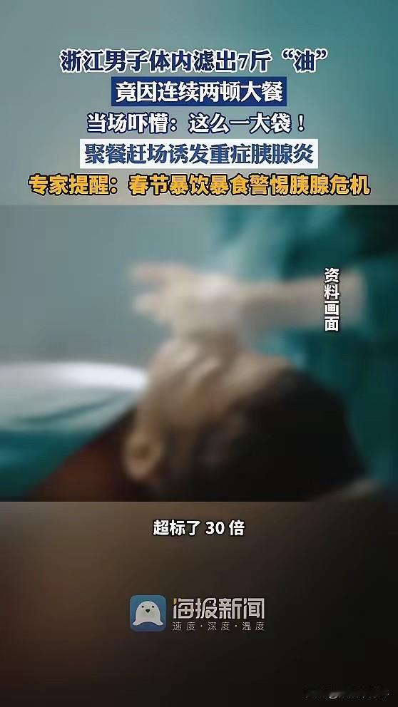 “悲剧还是发生了!”近日,浙江杭州,一男子和同事聚餐大吃大喝,接着又赶了顿夜宵,回家后肚子剧痛就医,结果发现是急性重症胰腺炎!血里的甘油三酯超标了30倍,医生从他的体内滤出了7斤“油”,把男子都吓懵了!网友:还敢乱吃吗? 这事就发生在32岁的杭州程序员陈凯身上。那天公司年会,桌上全是硬菜:红烧肉、油焖大虾、烤全羊,还有冰镇啤酒。陈凯平时就爱重油重辣,那天更是彻底放飞,从晚上6点吃到9点,喝了三瓶啤酒,还啃了两大块东坡肉。 散场后同事又拉他去吃夜宵。烧烤摊的烤五花、烤腰子、炒螺蛳,他又造了不少,还灌了两瓶冰可乐。等他到家,已经是凌晨1点多。 刚躺到床上,上腹部突然像被刀绞一样疼,疼得他直冒冷汗,还不停地恶心呕吐。妻子吓坏了,赶紧打120。 到了医院,医生一看血检报告,倒吸一口凉气。甘油三酯正常范围是0.56-1.7mmol/L,他直接飙到56.8mmol/L,超标30倍。CT片显示,胰腺已经严重水肿、坏死,确诊为急性重症胰腺炎。 医生立刻给他做血浆置换,从他体内滤出足足7斤油脂混合物,装在袋子里,像一大袋浑浊的猪油。陈凯醒过来看到那袋东西,整个人都懵了,说这辈子再也不敢这么吃了。 这事听着吓人,但一点都不罕见。每年春节,医院消化科都挤满因为暴饮暴食、喝酒过量被送进来的人。 我有个朋友,去年大年初三跟着家里人连吃三顿酒局,当天晚上就因为急性胰腺炎住院,住了半个月,瘦了20斤。医生说,再晚来两个小时,命都保不住。 很多人觉得,过年就是要“吃好喝好”,不然对不起这一年的辛苦。可他们忘了,身体不是垃圾桶,更不是无底洞。 那些重油重盐的菜、冰镇的酒、深夜的烧烤,看起来是在犒劳自己,其实是在透支生命。 急性重症胰腺炎死亡率很高,就算救回来,也可能留下糖尿病、胰腺功能不全等后遗症,一辈子都要忌口。 更讽刺的是,很多人一边在医院插着管子,一边刷着手机里的“春节养生指南”,转头又在酒桌上说“没事,难得聚一次”。 这种自欺欺人的“狂欢”,到底是在庆祝,还是在玩命? 我们批判的不是聚餐,而是那种“不醉不归、不吃到撑不罢休”的畸形社交。 很多时候,我们不是饿,是怕扫了别人的兴;不是馋,是被“过年就要放纵”的氛围绑架了。 可健康从来没有“下次注意”,只有“为时已晚”。 陈凯出院后,把家里的油炸锅、烧烤架都扔了,每天坚持跑步,吃饭只吃七分饱。他说,那袋7斤的“油”,是他这辈子最深刻的教训。 春节的意义,从来不是胡吃海喝,而是和家人平安健康地坐在一起,吃一顿热乎的饭。 别让一顿饭,毁了一整年的福气。 各位读者你们怎么看?欢迎在评论区讨论。