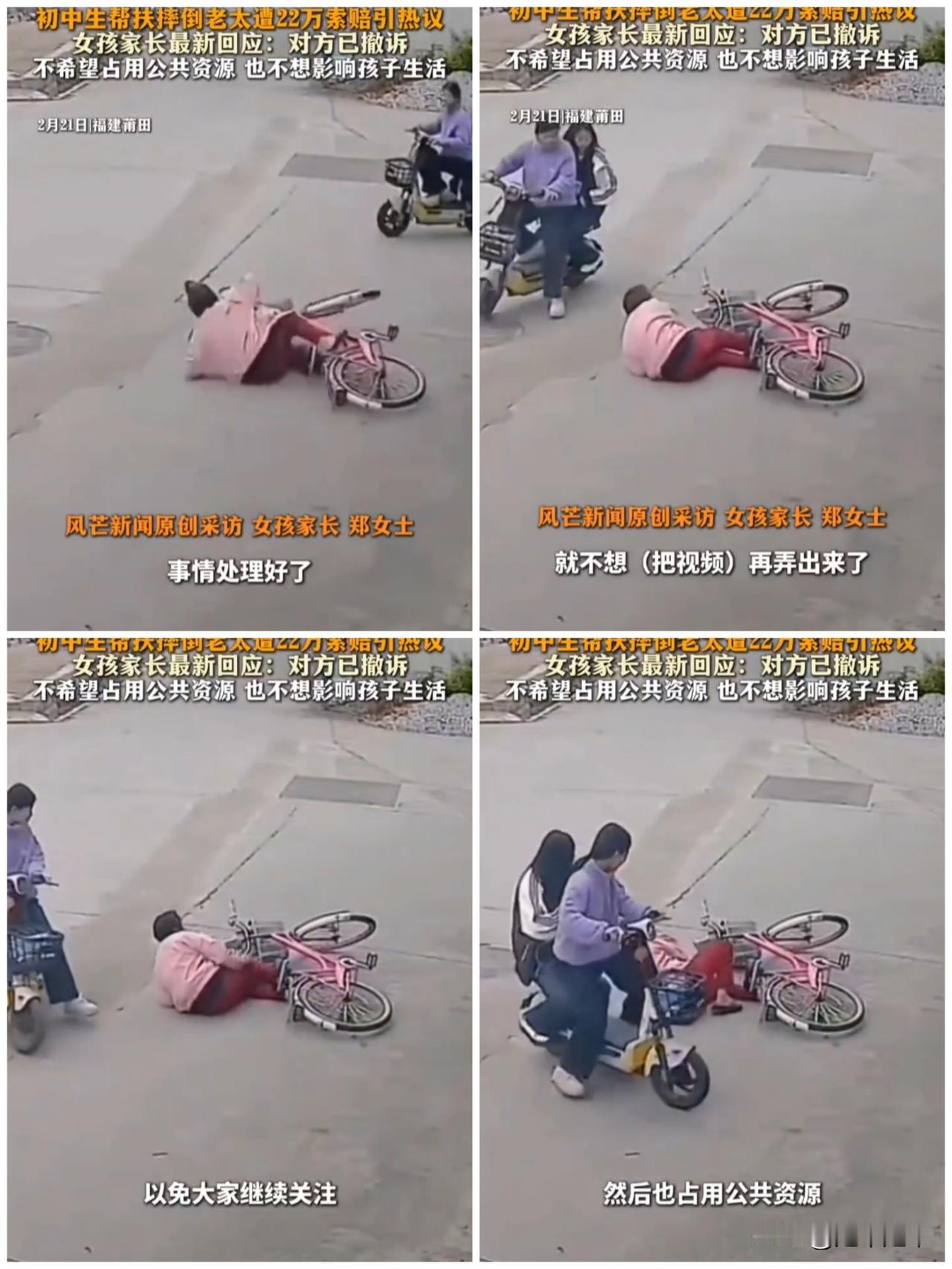 福建两名初中女生扶起摔倒老人反被索赔22万元事件迎来转折。 26年2月21日,女生母亲郑女士向媒体证实,原告已撤回诉讼并删除此前发布的抖音、朋友圈内容。家属表示事件“已妥善处理”,希望不再占用公共资源。 监控显示老人摔倒前已有避让轿车动作,女生驶近发生在摔倒后,该如何证明老人受惊吓摔倒与女孩骑行行为存在因果关系,只是凭老人的单方证言和交警大队的的经验作为裁决标准,是给大众有因果链不合理性的猜疑。 这些年,很多司法事件争议非常大,不妥的司法判决会造成社会撕裂。此次索赔案件针对交通违规责任,大众担忧无接触责事故的认定,会侵蚀善意救助的原则。若司法支持无接触高额索赔,可能助长“惊吓式碰瓷”风险,导致社会冷漠。另外该事件最可怕的是它会悄悄消耗社会信任,善良一旦被算计,下次遇到需要帮助的人,很多人会先犹豫、先自保。讹诈成本太低,守护善意的成本就会变高。必须明确是非、厘清责任,不让做好事变成高风险行为,不让正义输给冷漠。 而此次撤诉避免了司法判决可能引发的道德争议。扶起老人被讹 扶人责任争议