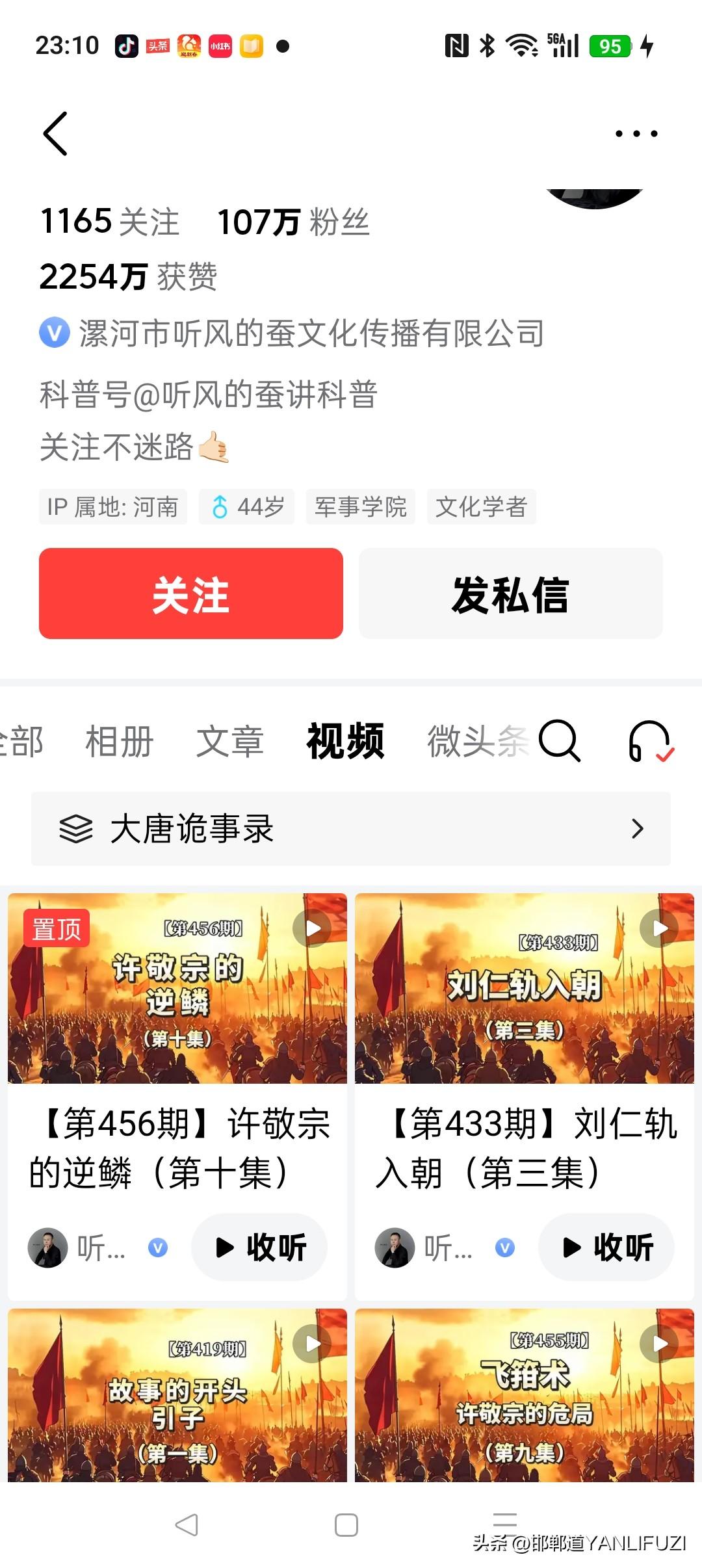 这是听风的蚕的新视频, 账号的名字叫烈隐听风, 他听风的蚕的账号还停留在1月26日。粉丝107万,《大唐迷案》还是停在第十集。烈隐听风已经讲到23集了。是从2月14日开始的。 各位想看,就去看看吧,有人说是正宗的蚕。 网上说听风的蚕(本名朱唯一) 账号被平台严厉处置,粉丝从近2000万暴跌至约300万450+期视频几乎全删,仅留10余条 账号还无法关注、矩阵号也同步封禁。 官方原因是,违反法律法规与平台规则(直播背景出现不当诗句、内容敏感、带货过度等) 他本人至今未公开回应,账号基本处于“消失”状态 他创立了烈隐品牌,取自漯河古称“隐阳城”。 烈隐听风是他旗下的白酒产品名(酱香酒)