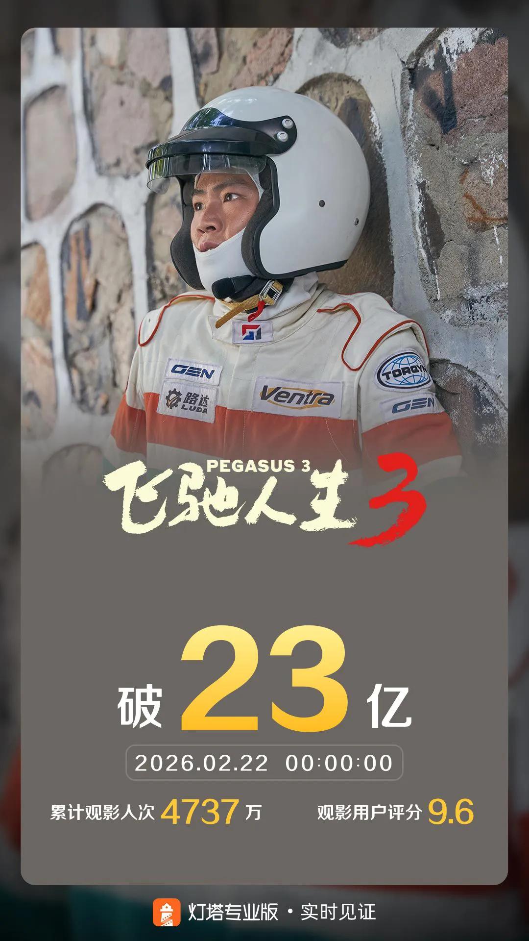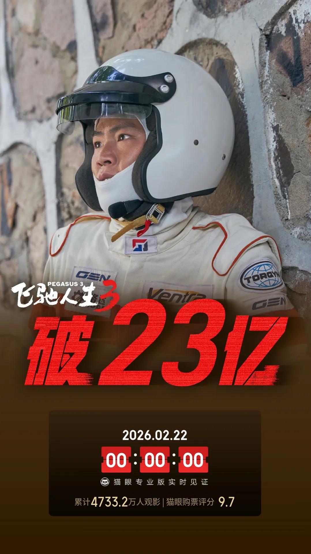 《飞驰人生3》票房破23亿,沙溢成为百亿票房男主演。 由韩寒执导,沈腾、尹正、黄景瑜、张本煜领衔主演,魏翔、沙溢、范丞丞、孙艺洲主演,段奕宏特邀主演,张新成、胡先煦、李治廷、白宇帆、周政杰、高华阳特别出演,贾冰、王安宇、陈永胜、冯绍峰、郝瀚友情出演的喜剧电影《飞驰人生3》累计综合票房破23亿,超越《羞羞的铁拳》、《八角笼中》等片,进入内地影史票房总榜37强;超越《捉妖记2》、《疯狂的外星人》,跻身春节档历史16强。 《飞驰人生3》汇聚了数十位男演员共同出演,沙溢也挑战了一个性格复杂的角色。在《飞驰人生3》的助力下,沙溢主演电影累计票房已经突破100亿。飞驰人生3 春节档电影