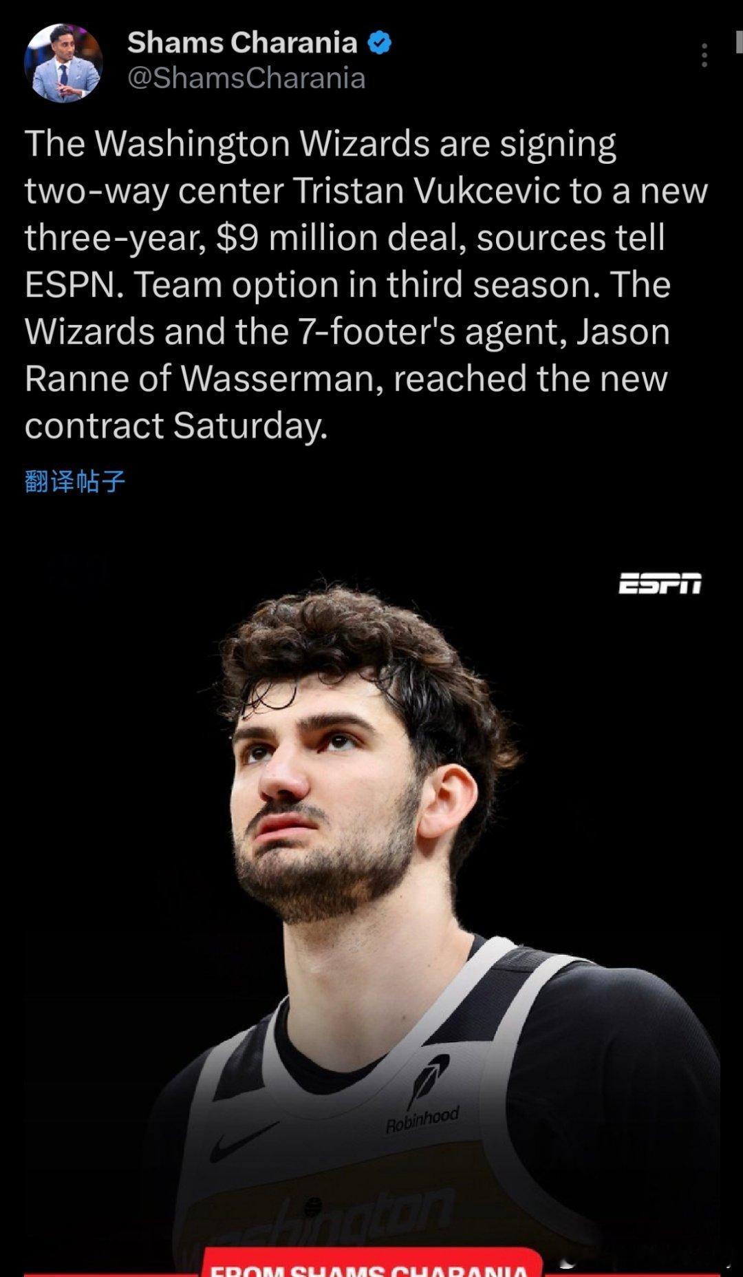 Shams:华盛顿奇才与双向中锋武克切维奇续签一份为期三年价值900万美元的合同,第三年为球队选项。