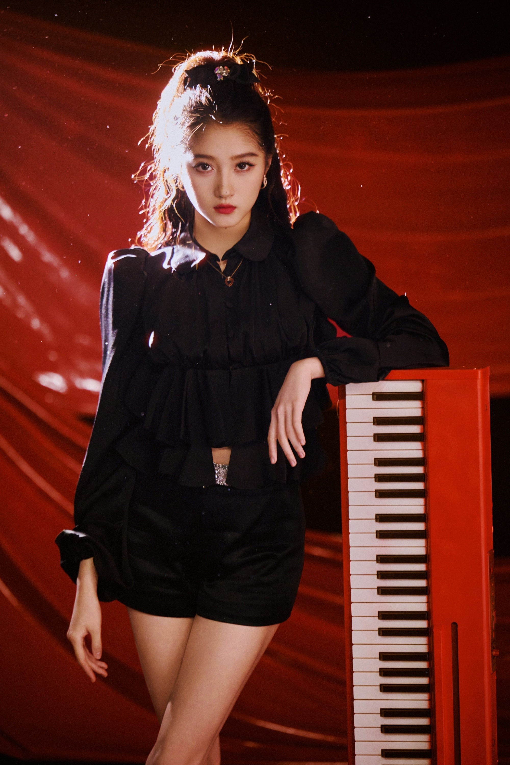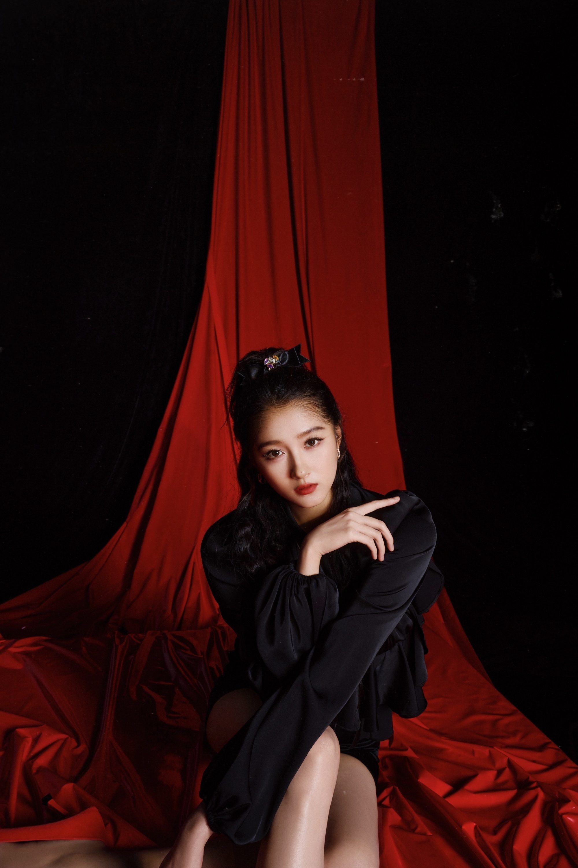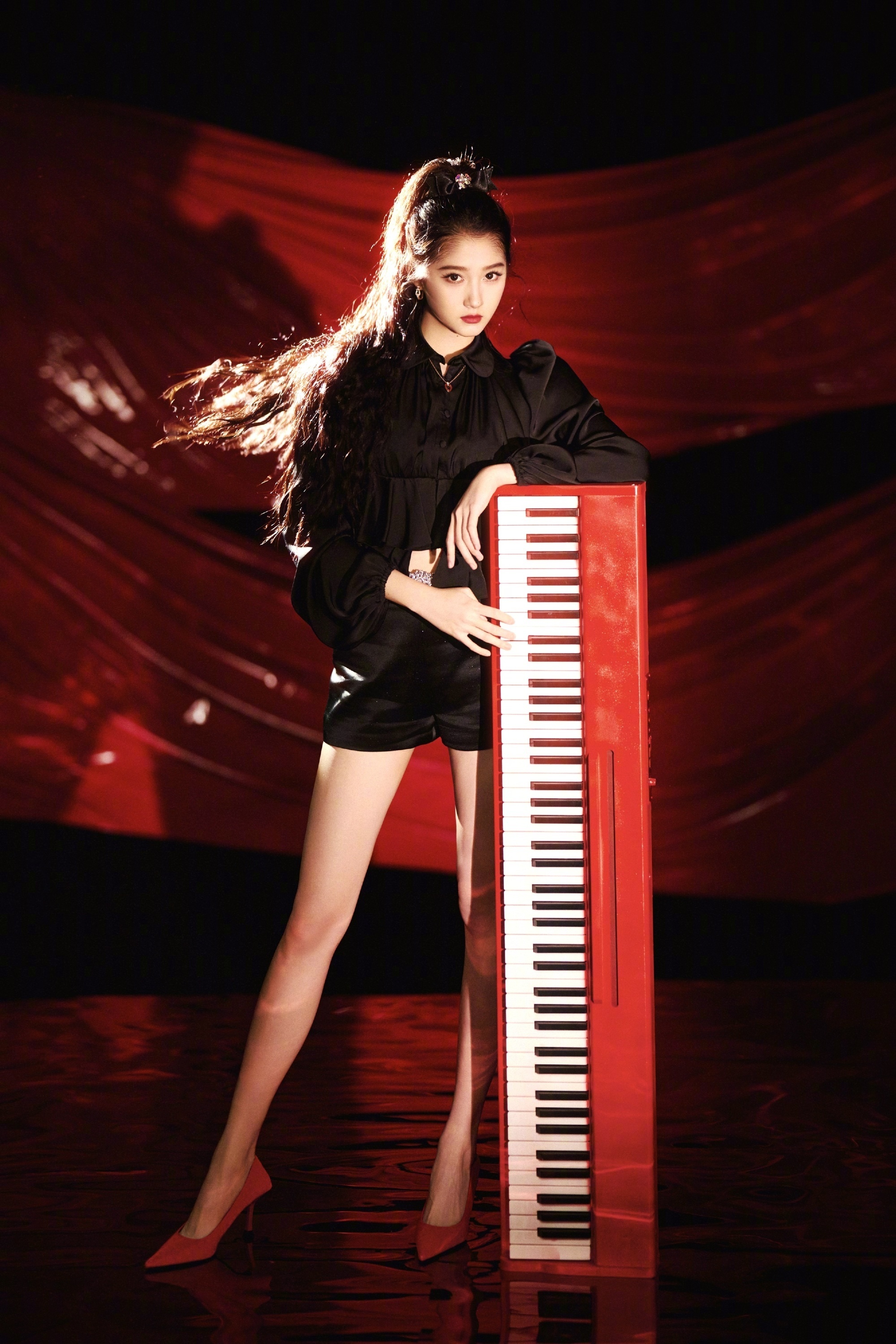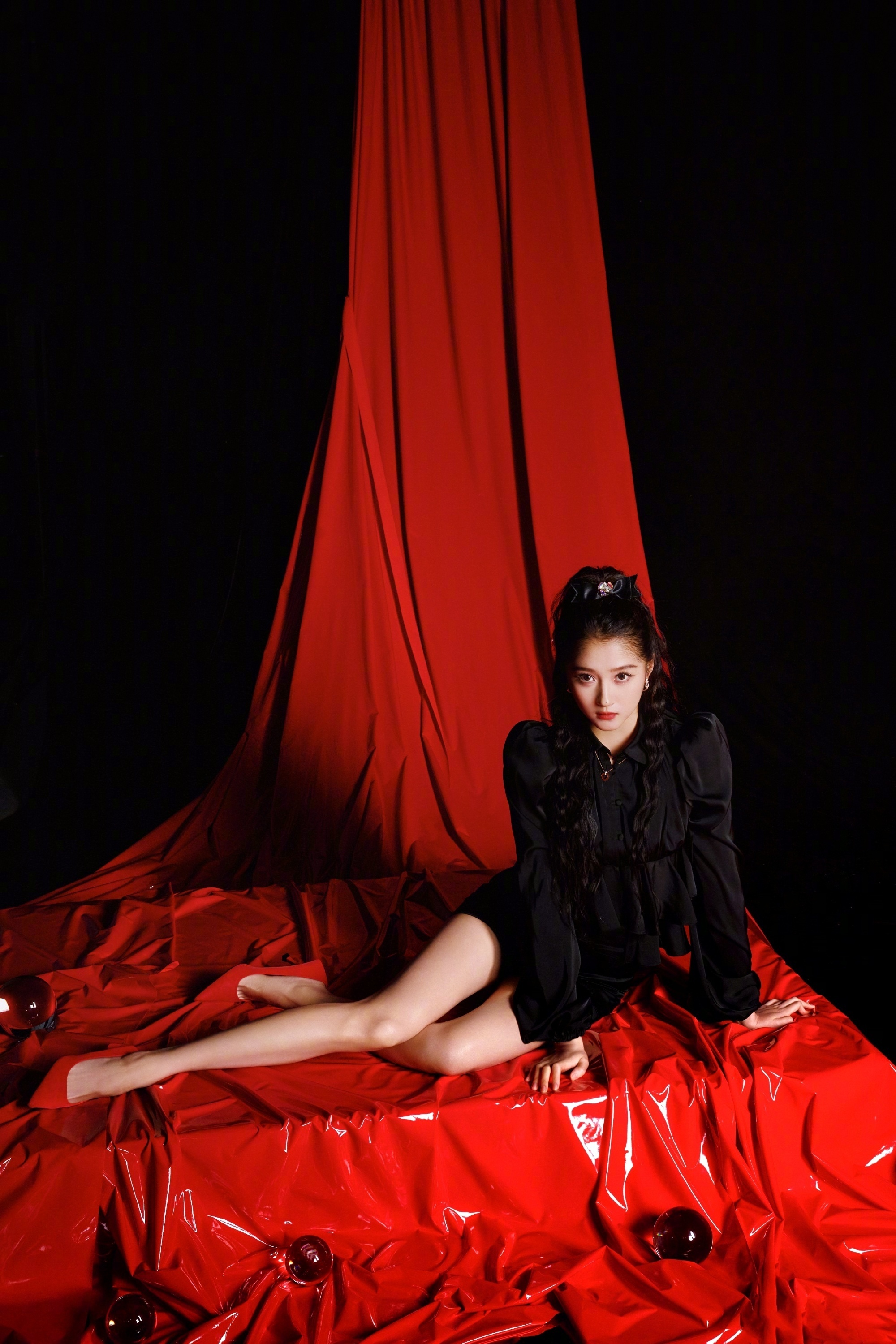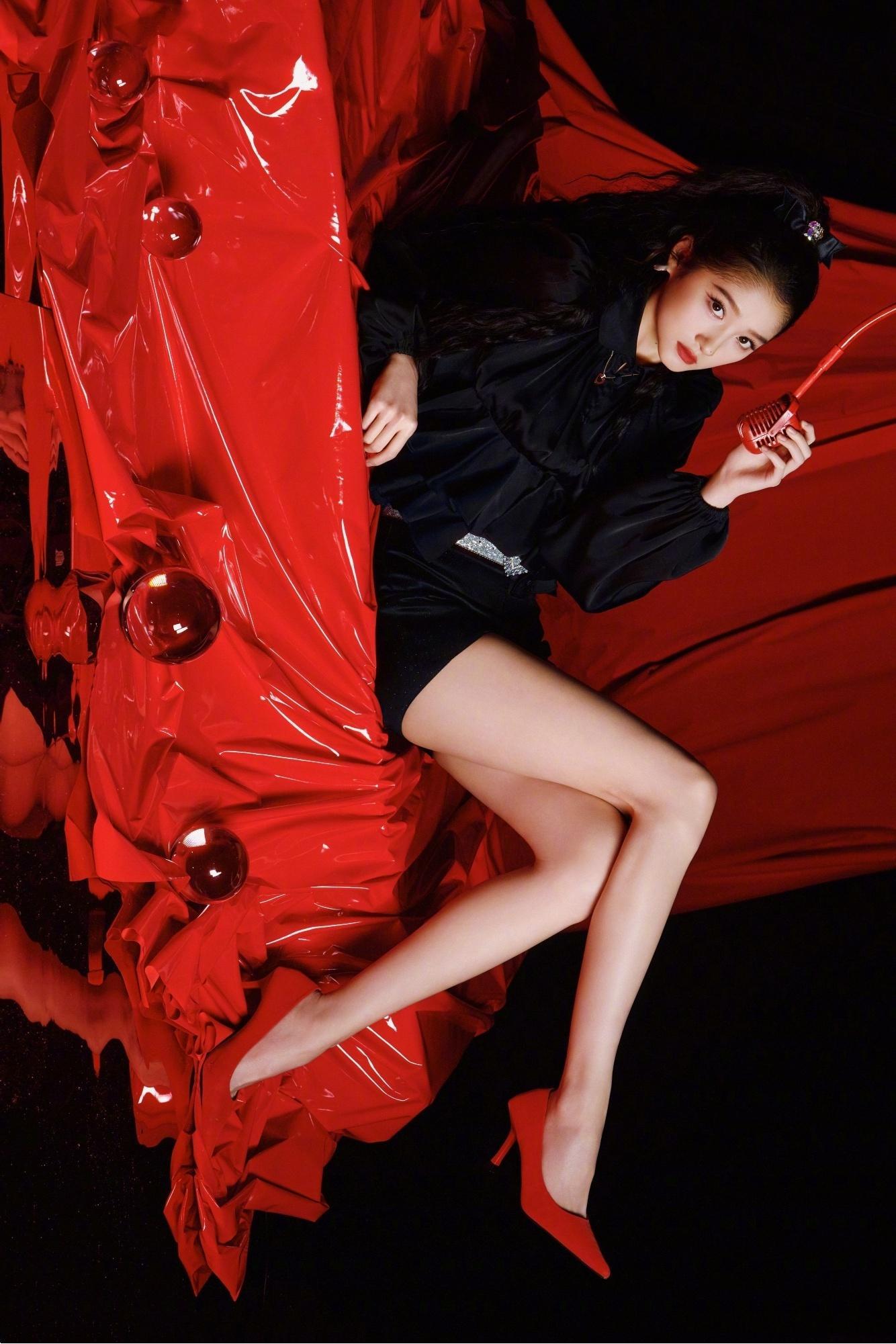 关晓彤黑色酷美穿搭:大长腿穿上红色高跟鞋。关晓彤