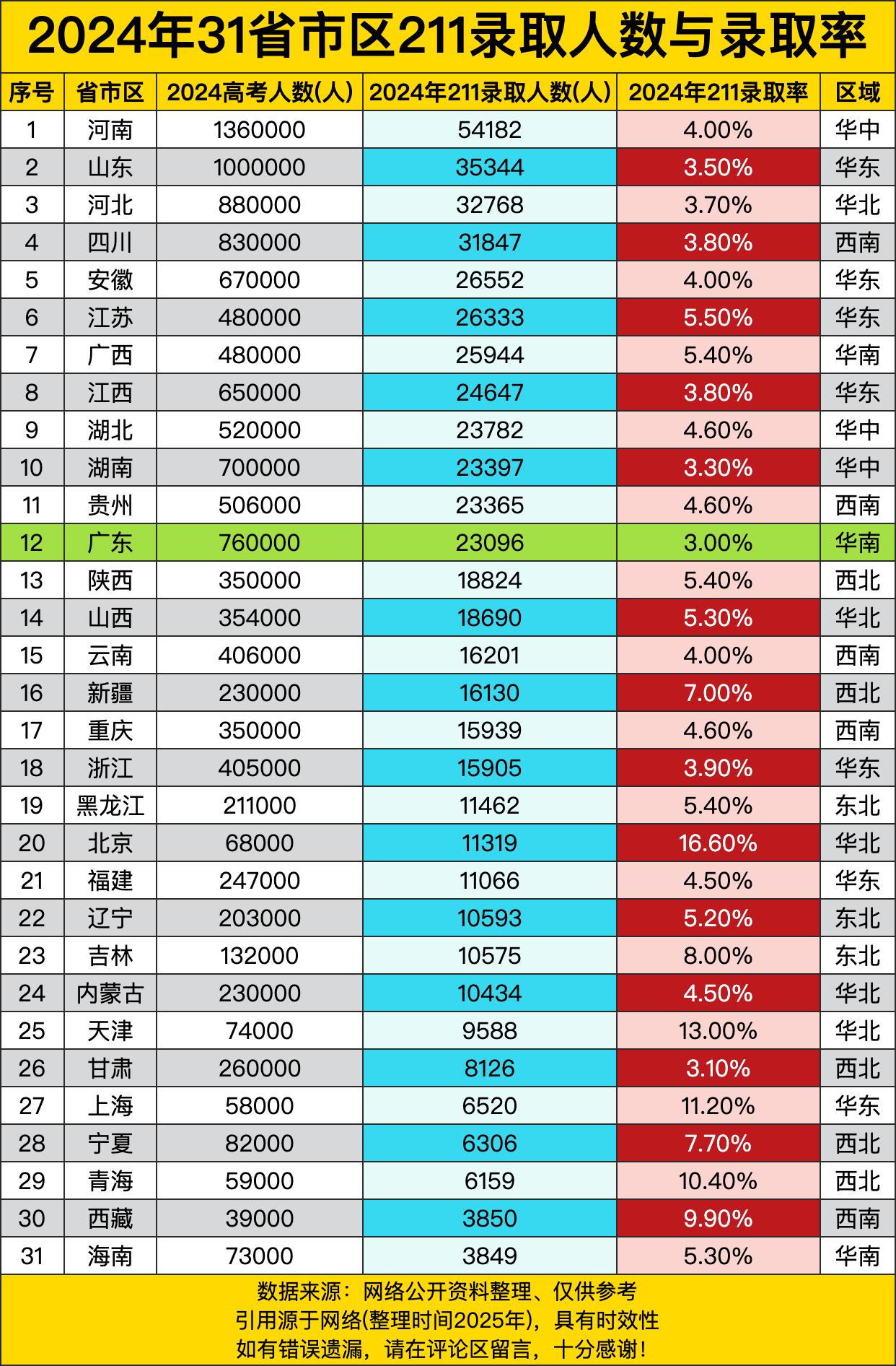 河南那高考人数,136万,简直是千军万马过独木桥!5万多考进211,录取率4%,看着不算低,但架不住人多呀。就像大池塘里捞鱼,鱼是不少,可想捞到好鱼也费劲呐。再看山东,百万考生大军,录取率3.5%,真的是竞争激烈,每一个录取名额都得拼个头破血流! 嘿,再瞅瞅那些录取率高的地方。北京可太让人眼馋了,就6.8万考生,录取率高达16.6%!这就好比在自家小院子里随便捞几条鱼,那还不轻松?还有上海,录取率11.2%,吉林8%,天津13%。人家那边考生少,高校资源相对还多,真是老天爷追着喂饭吃,在这些地方高考,压力瞬间就小了不少。 然而像广东,76万考生,录取率却只有3%,简直是高考“洼地”。人也不少,录取率却低得可怜,就像在沙漠里找绿洲,难啊!这差距,让广东的家长们能急得跳脚。还有湖南、四川这些地方,录取率也不高,考生们太不容易了,每一步都走得艰难。 这各地高考录取情况,真的是旱的旱死,涝的涝死。有的地方考生躺着都能上211,有的地方孩子拼死拼活都不一定能够着。咱也希望教育资源能更均衡些,别让孩子们一出生就输在这起跑线上。不过话说回来,不管在哪儿,努力学习才是硬道理,说不定哪天政策变了,大家都能有个好前程呢!
